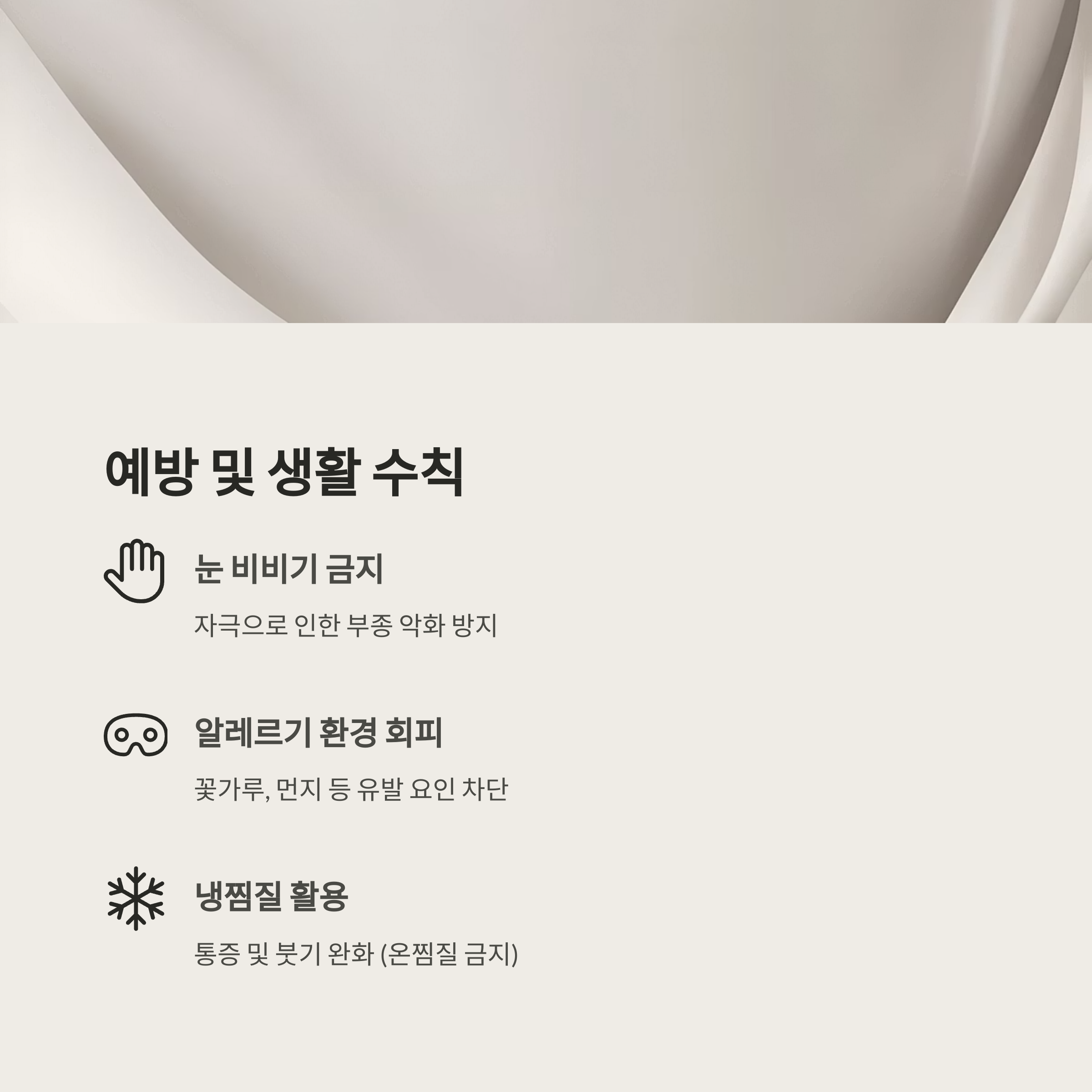 | 눈 비비기 금지 | 자극으로 인한 부종 악화 방지 |