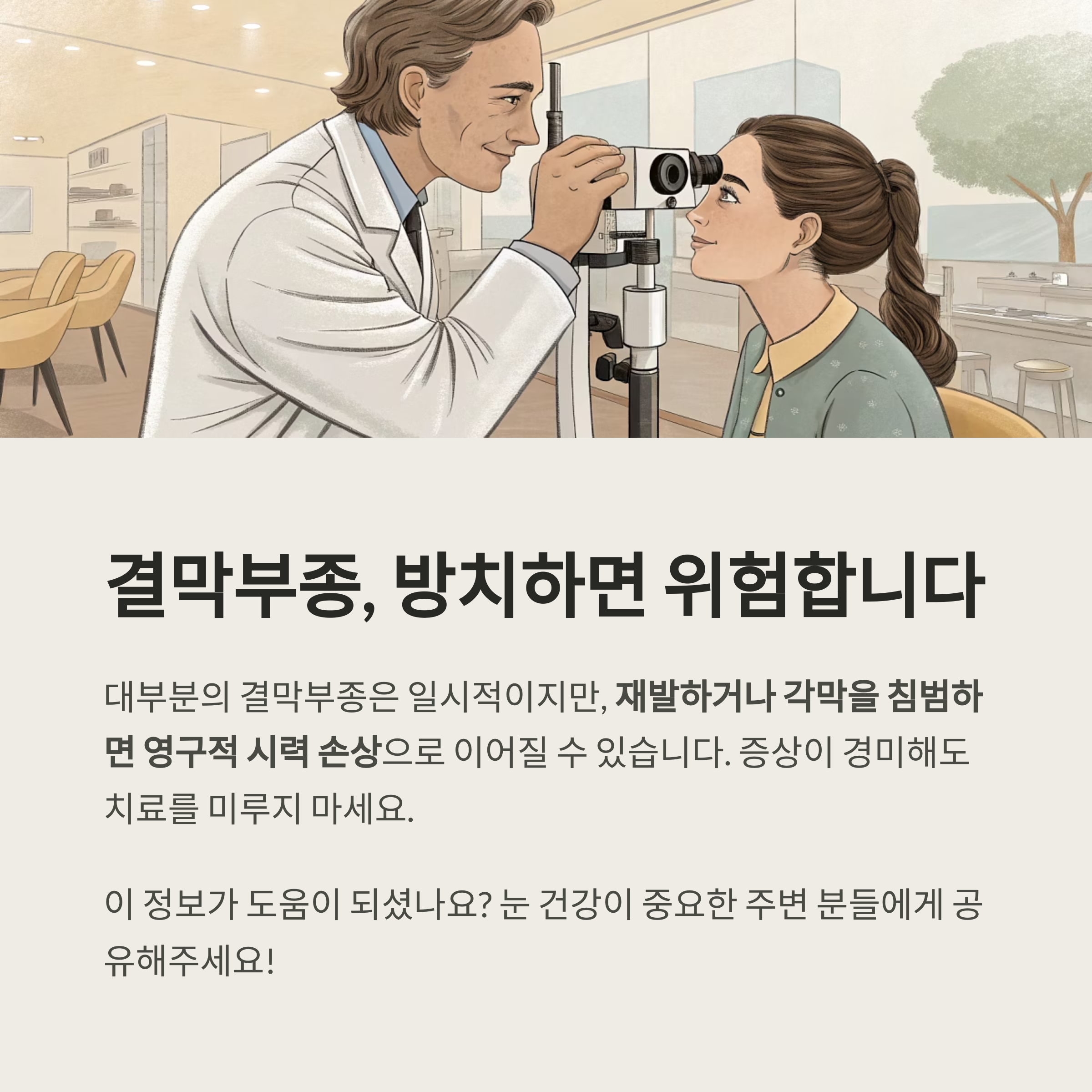 심할 경우 각막에 손상을 주어 시력에 영향을 줄 수 있어 빠른 진단과 치료가 필요합니다.