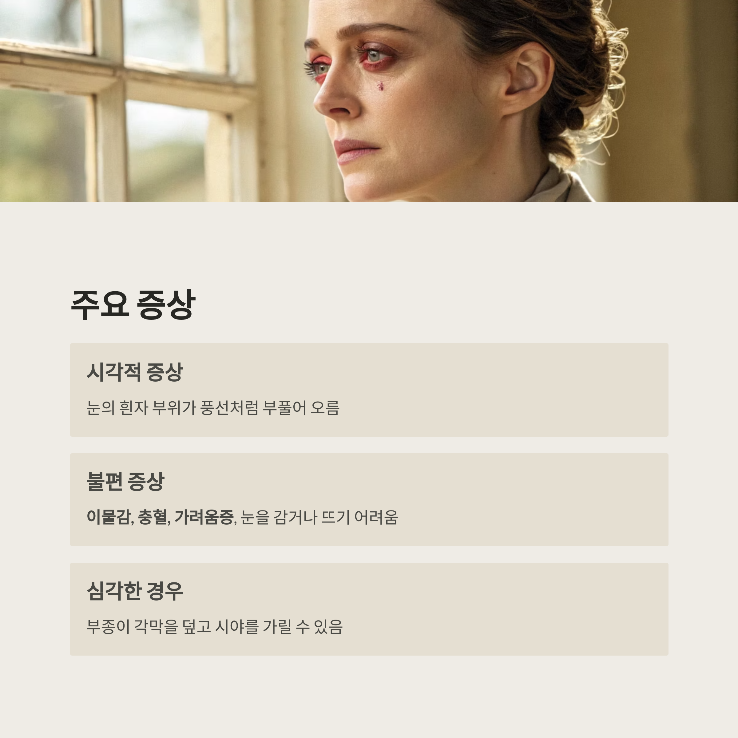 | 각막 침범 | 응급 조치 및 전문 치료 필요 | 지연 시 시력 저하 위험 |
