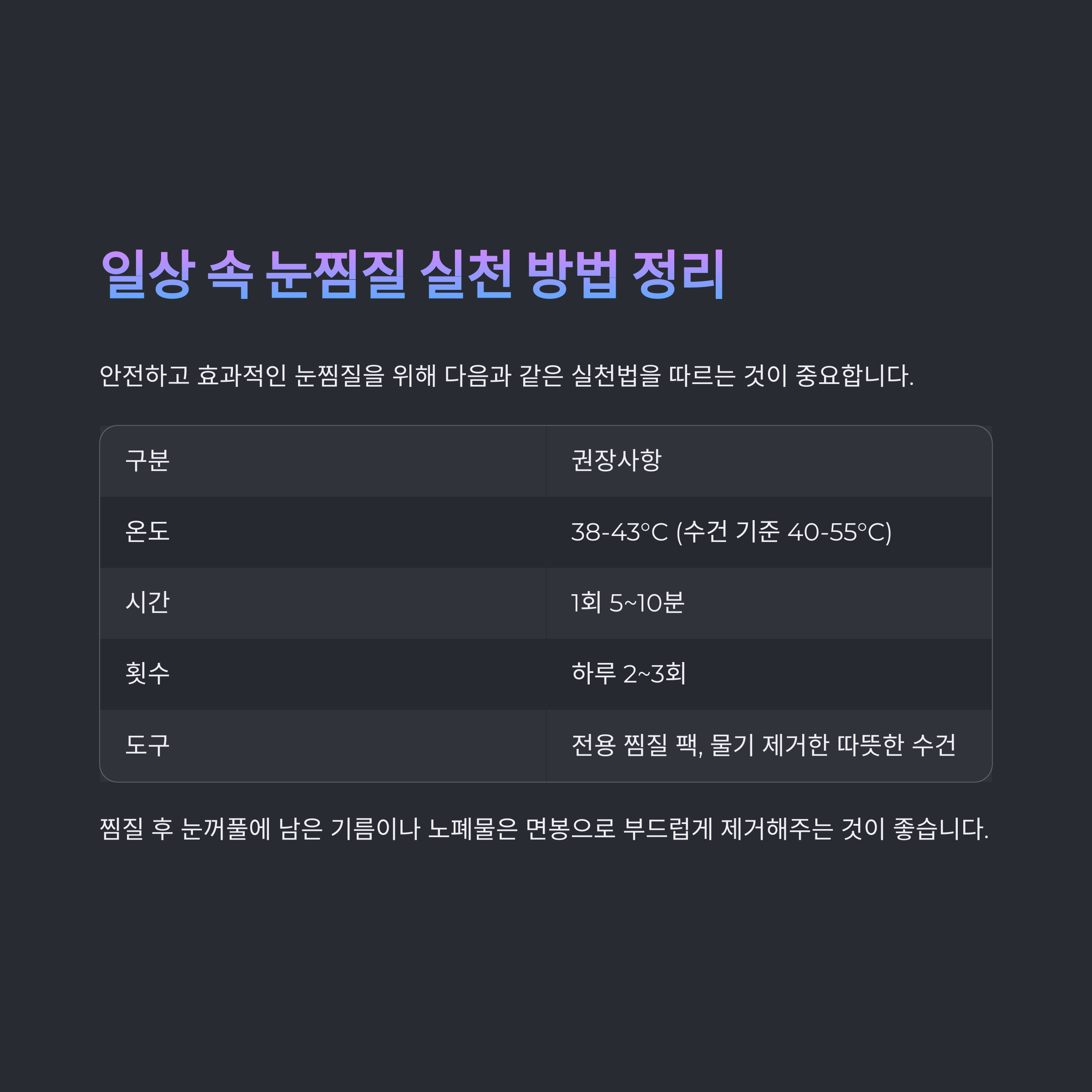 눈찜질은 단순히 눈을 따뜻하게 해주는 행위가 아니라, 안구건조증 완화와 눈 피로 회복, 마이봄샘 기능 개선 등 다양한 의학적 효과를 가져올 수 있는 실질적인 눈 건강 관리법입니다. 특히 하루 23회, 510분씩만 투자해도 눈의 초점 유지 능력이 좋아지고 시야 선명도가 일시적으로 향상된다는 점에서 꾸준한 실천이 강조되고 있습니다. 이 글에서는 눈찜질의 기본 원리와 적용 방법부터, 실제 임상 결과와 전문가 의견까지 정리하여 알려드립니다.