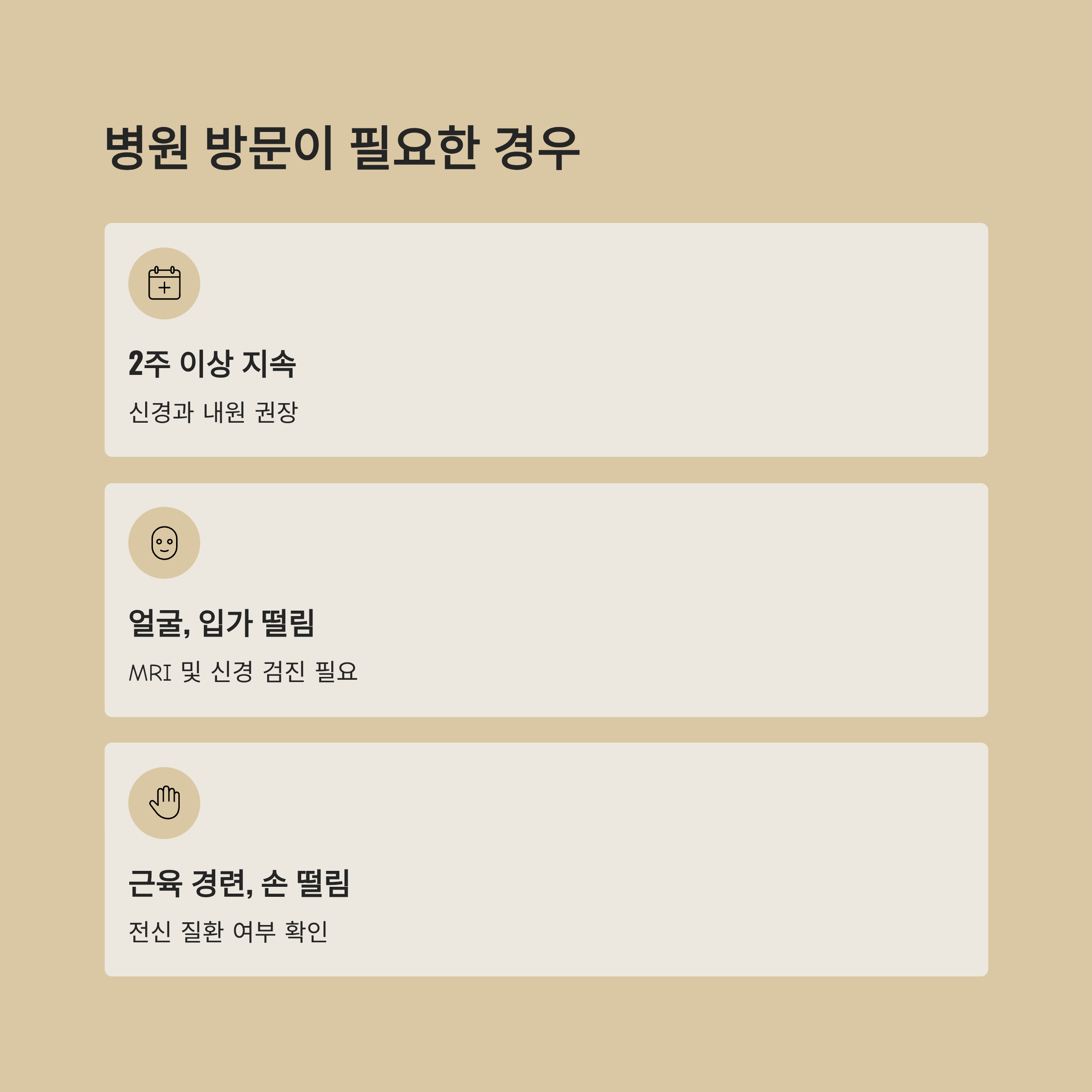 | 눈 외에 얼굴, 입가도 떨림 동반 | MRI 및 신경 검진 필요 |
