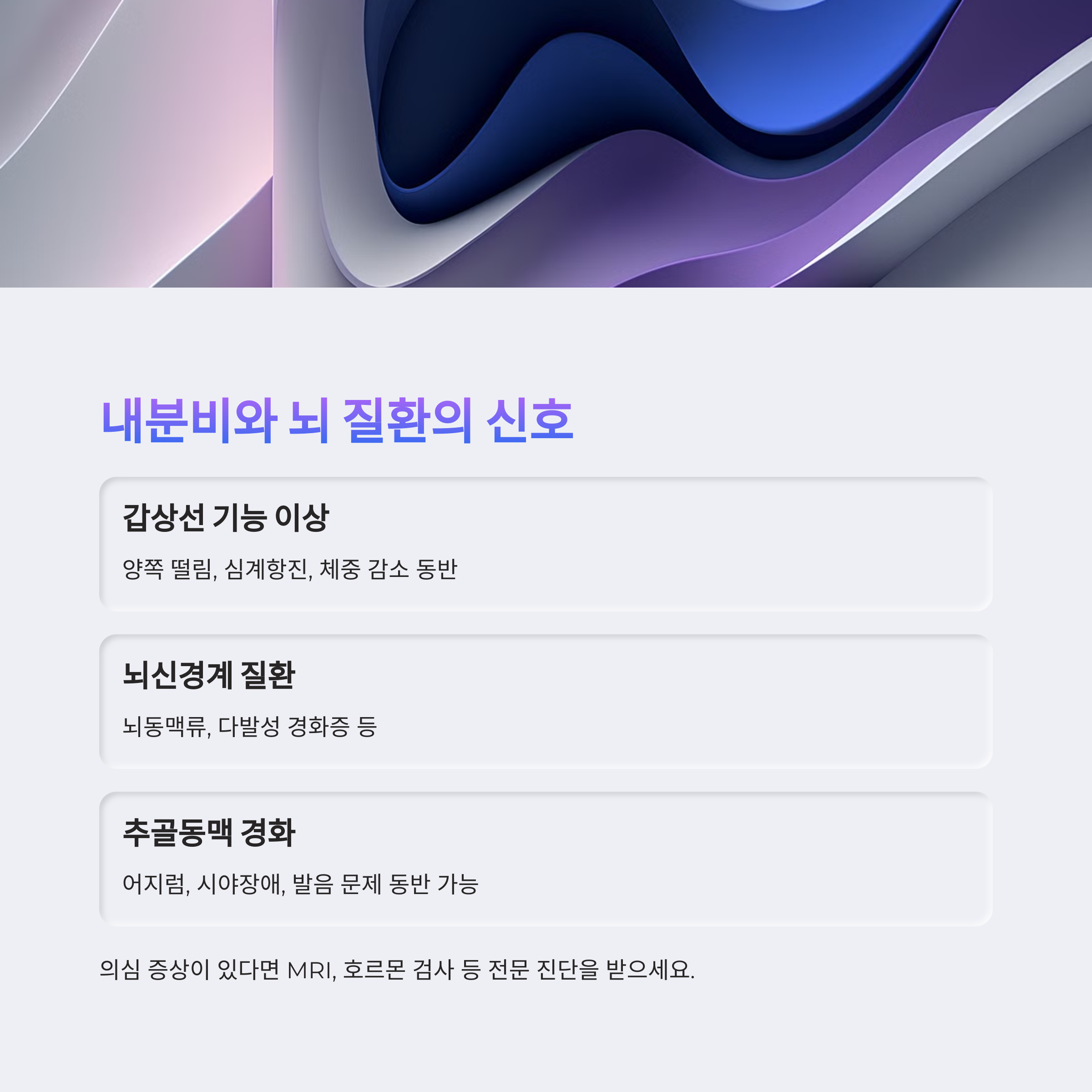 증상이 의심될 경우 반드시 MRI, 호르몬 검사 등 전문 진단을 받는 것이 좋습니다.