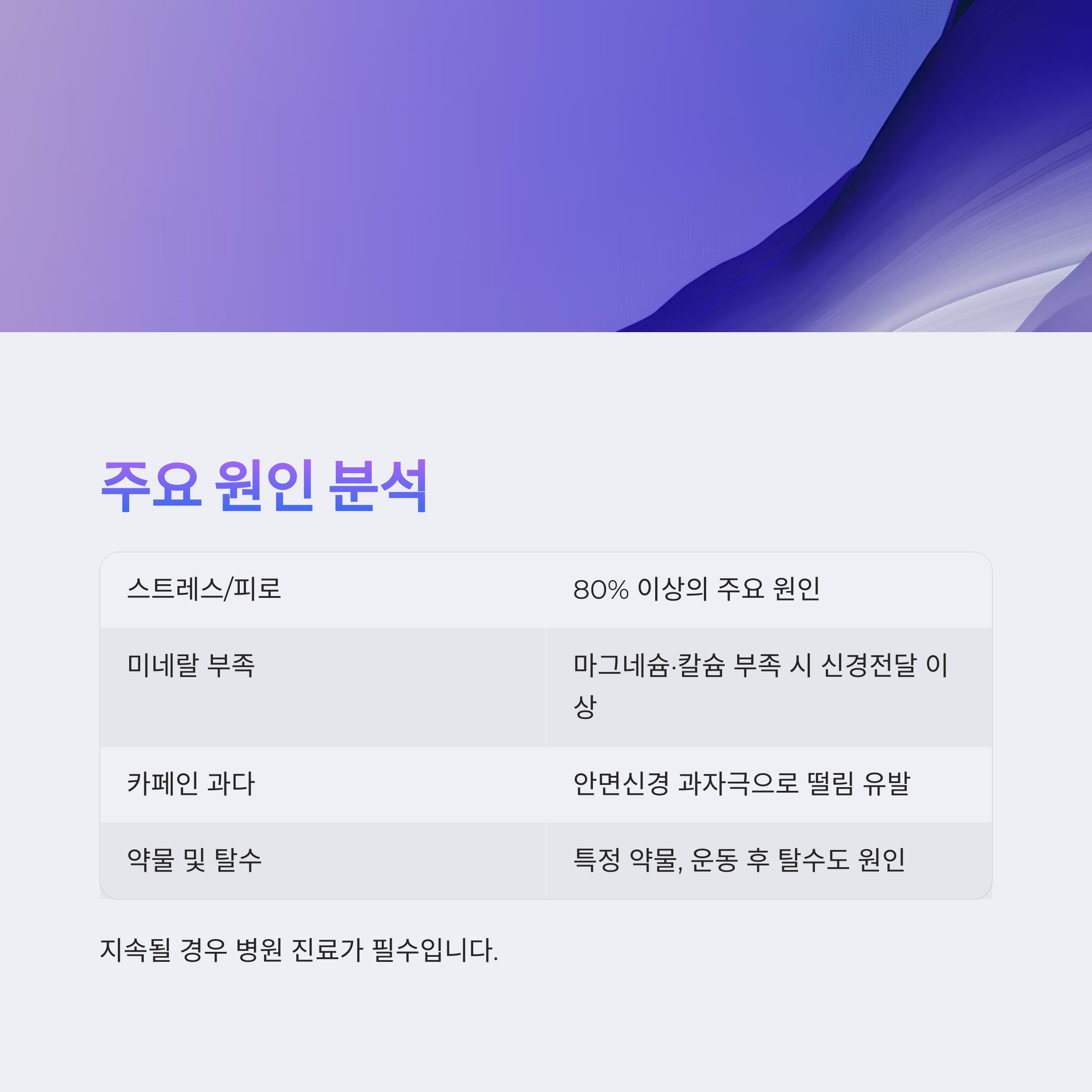 아래 표는 눈 밑 떨림의 주된 원인을 정리한 요약표입니다.