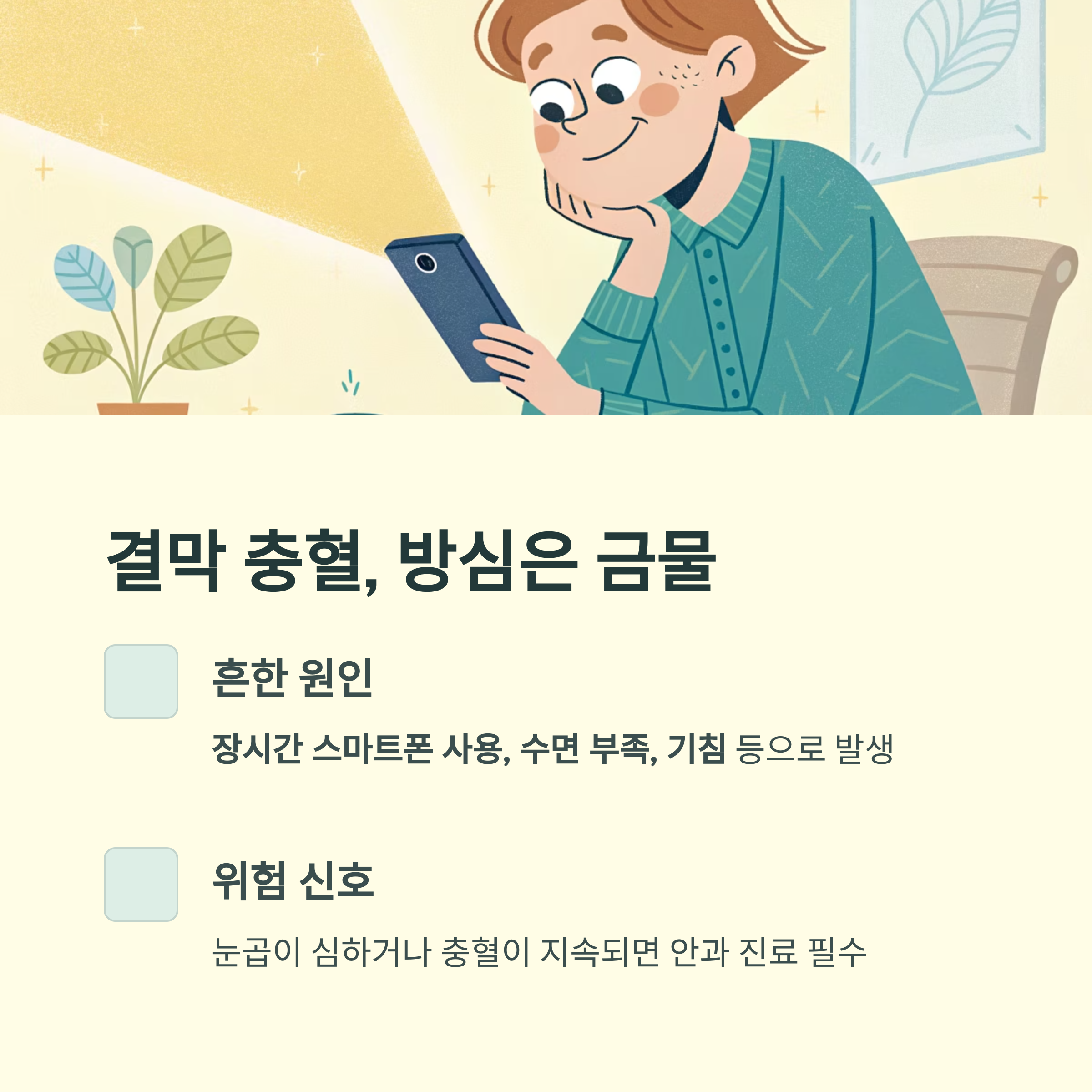 눈 충혈은 단순 피로 증상으로 가볍게 넘겨서는 안 되는 신호일 수 있습니다. 포도막염, 녹내장, 세균성 결막염과 같이 시력 저하에서 실명으로 이어질 수 있는 질환이 그 배경에 존재할 수 있기 때문입니다. 조기 진단과 정확한 치료, 그리고 생활 속 예방이 실명을 막는 가장 강력한 수단임을 잊지 말아야 합니다.