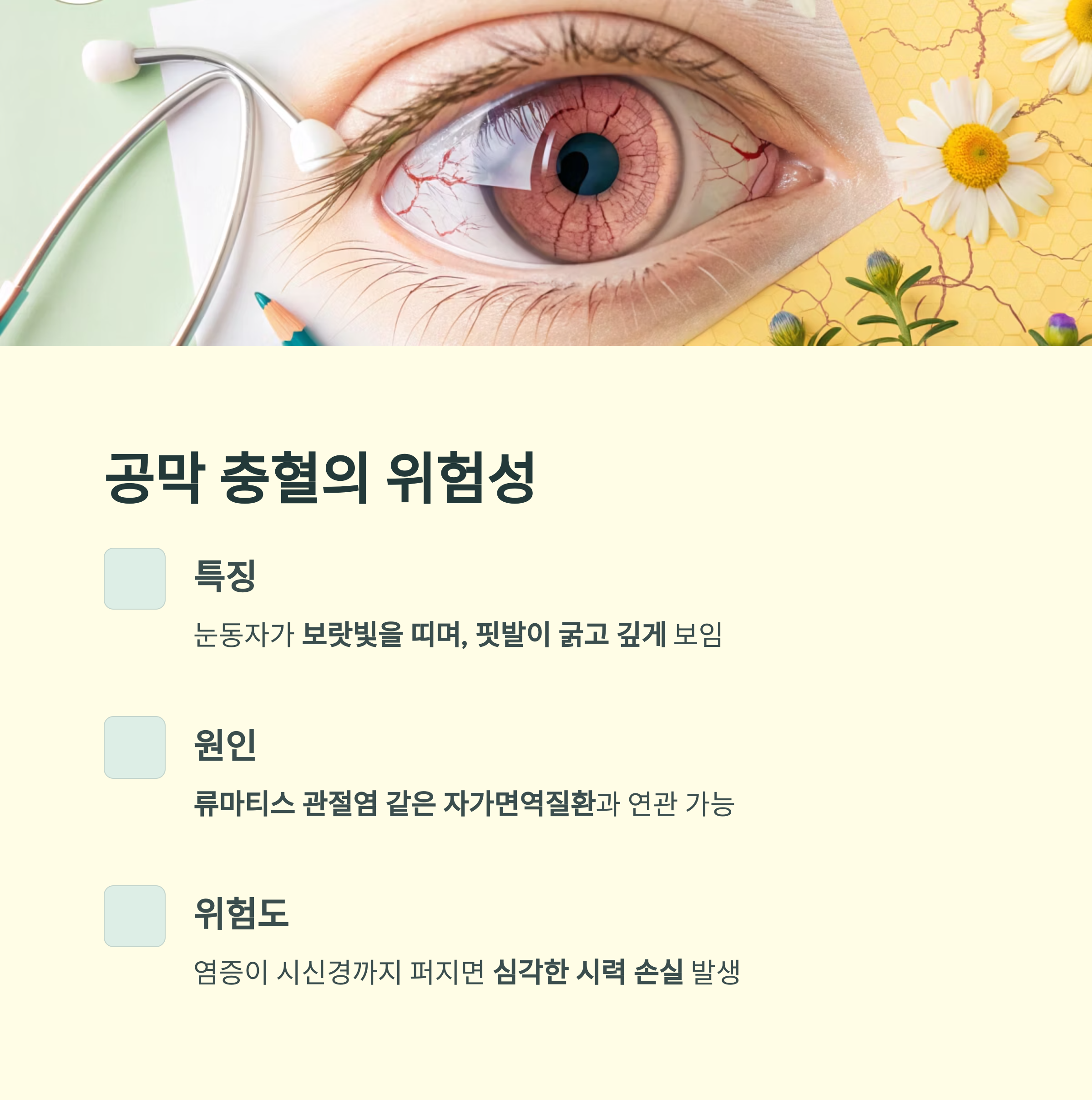 | 알레르기성 | 꽃가루, 먼지 등 | 각막 혼탁 시 시력 저하 |