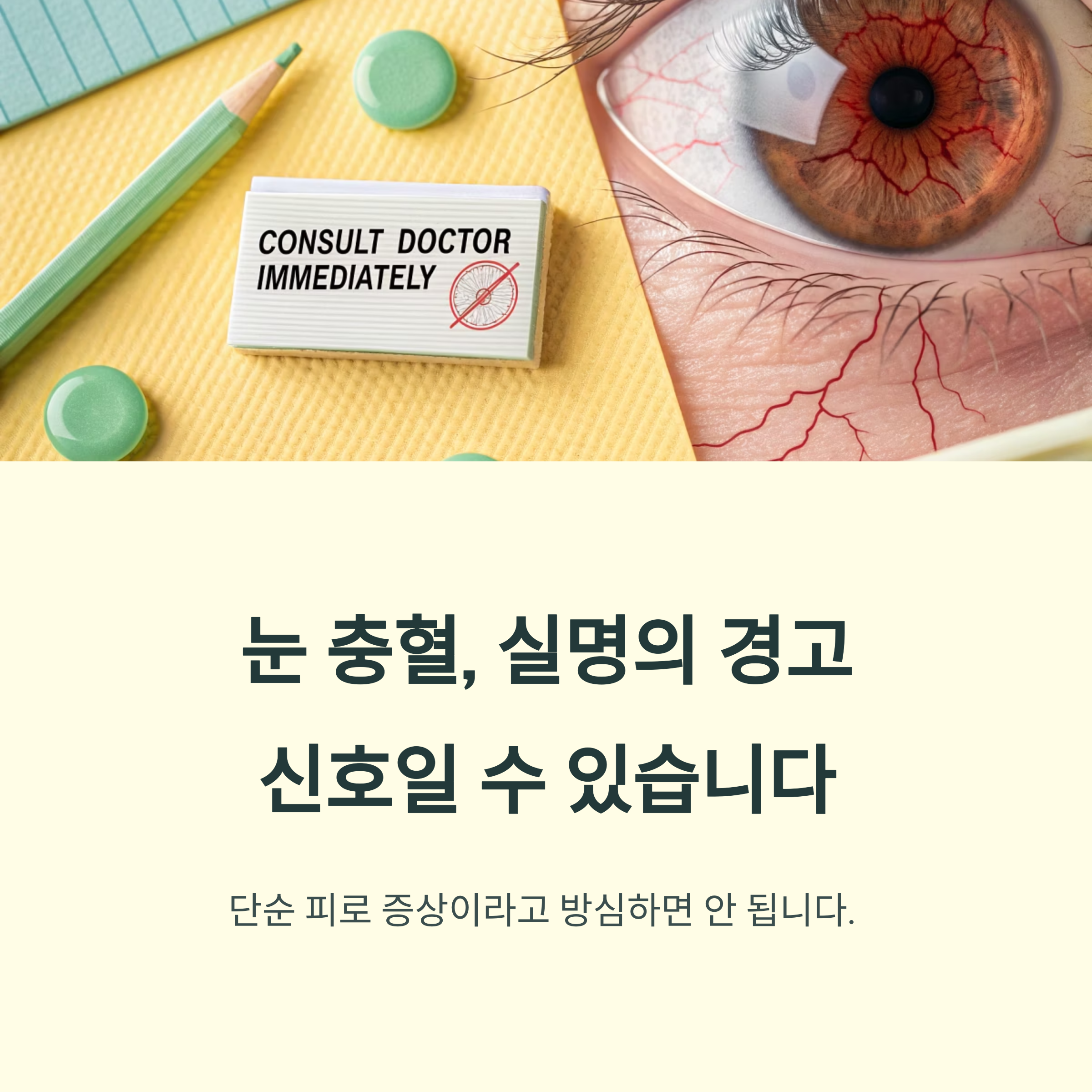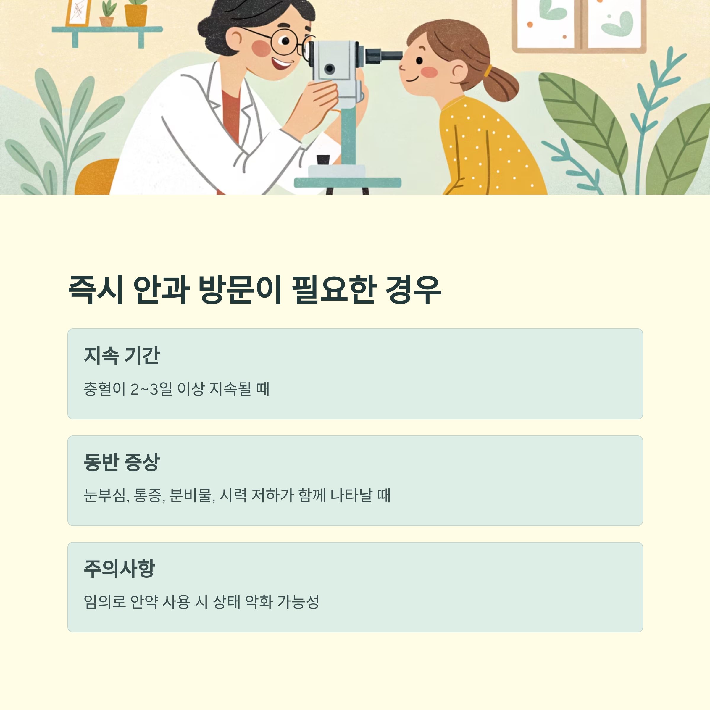 충혈이 2일에서 3일 이상 지속되거나 눈부심, 통증, 분비물, 시력 저하가 함께 나타날 경우에는 즉시 안과를 방문해야 합니다. 특히, 임의로 안약을 사용하거나 자가 치료를 시도하는 것은 상태를 악화시킬 수 있어 절대 피해야 합니다.
