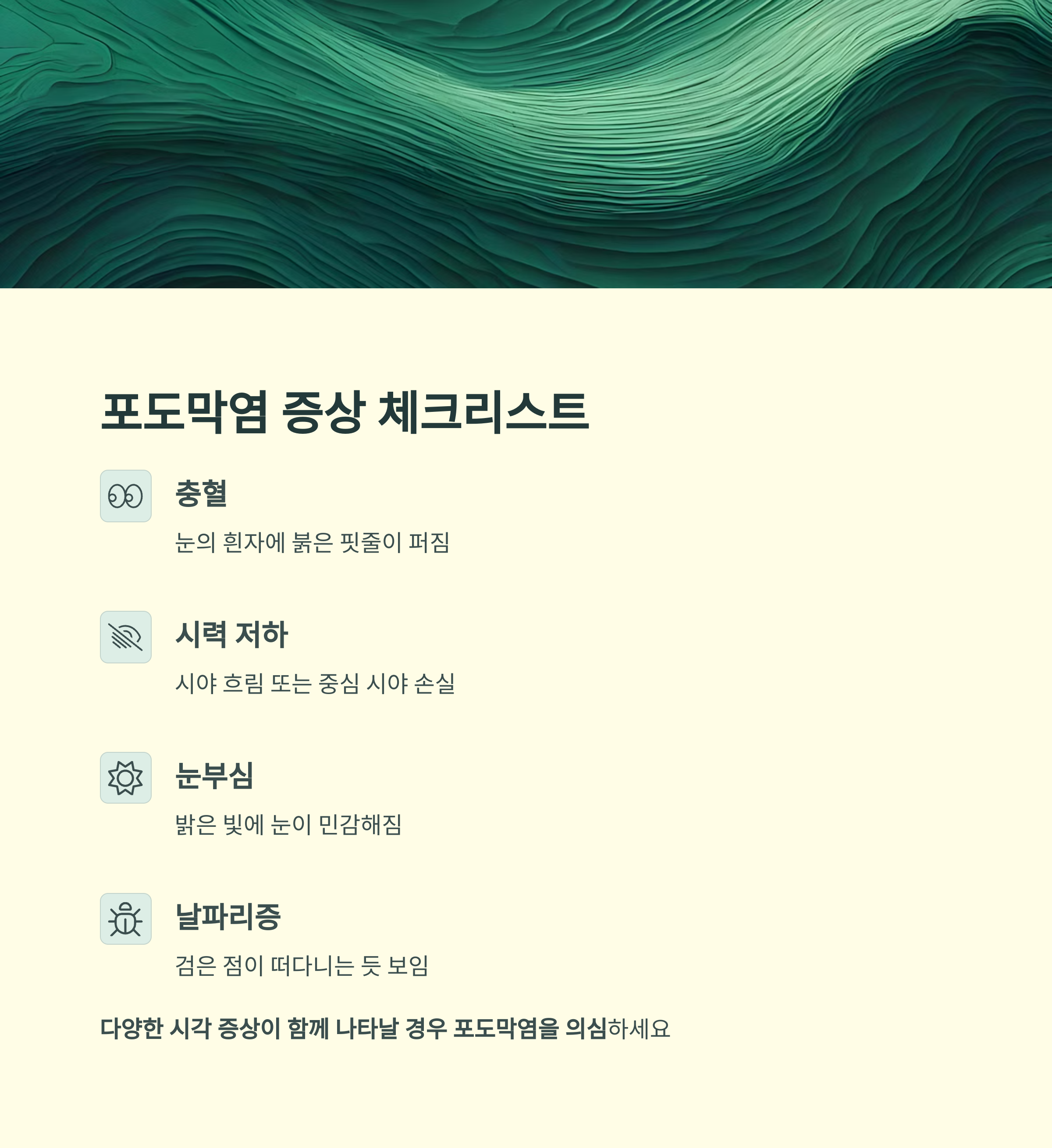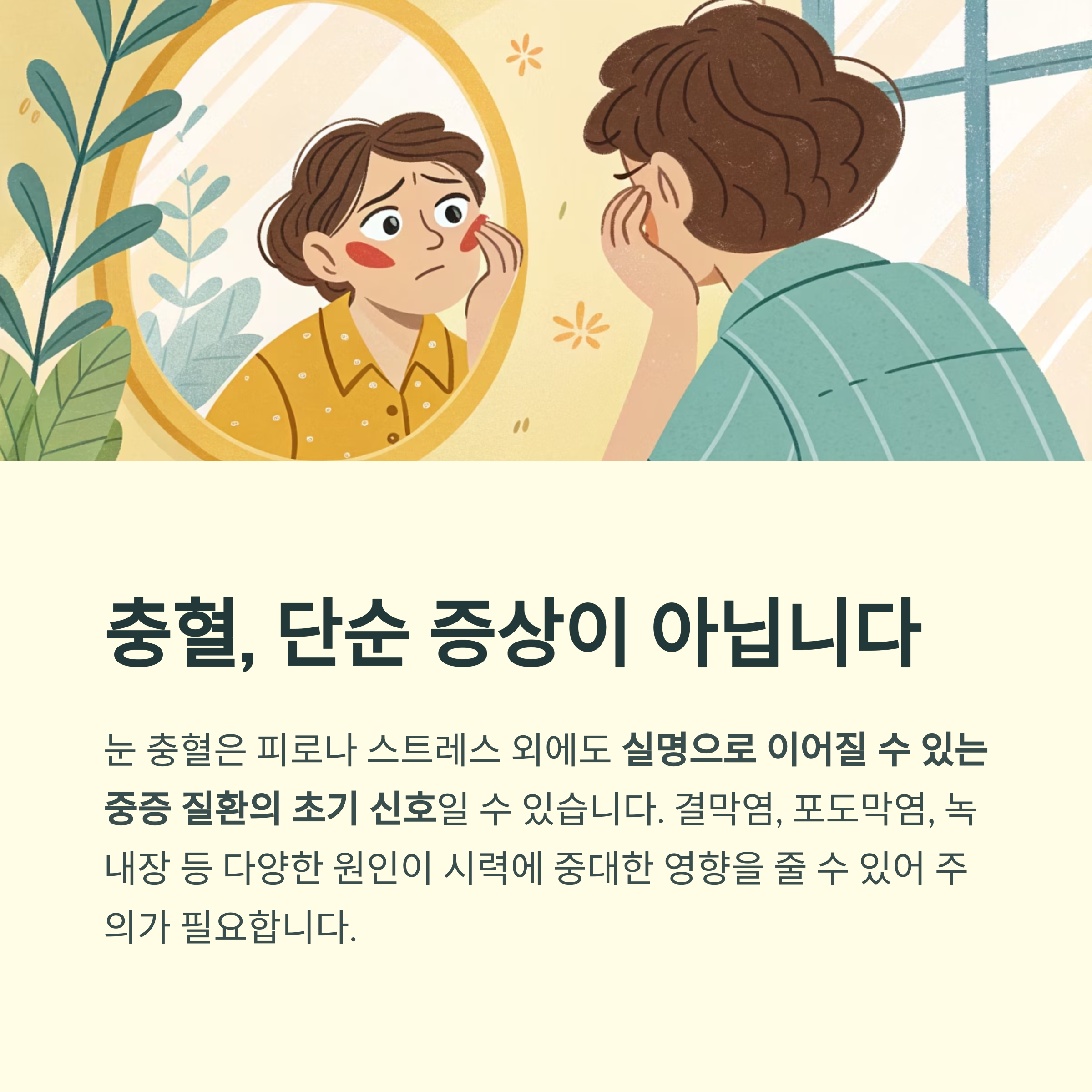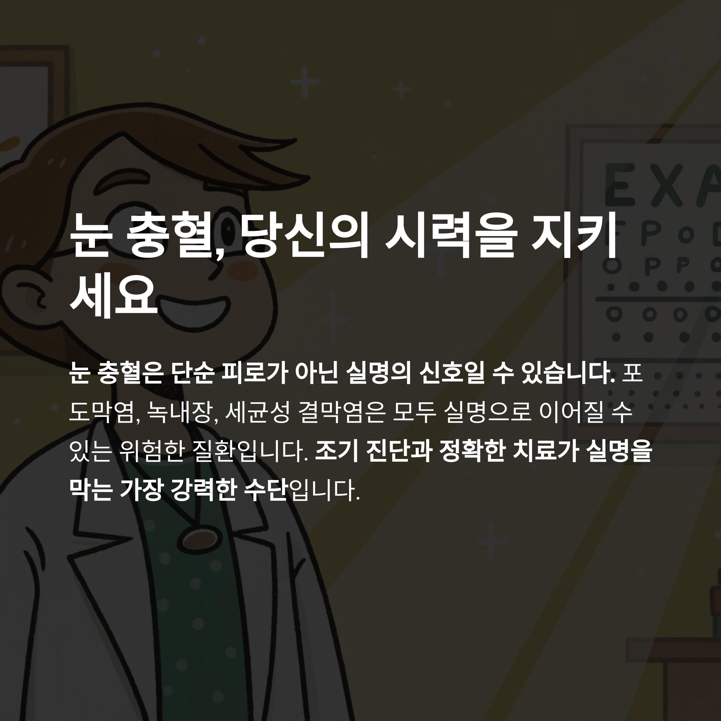 눈 충혈은 단순 피로 증상으로 가볍게 넘겨서는 안 되는 신호일 수 있습니다. 포도막염, 녹내장, 세균성 결막염과 같이 시력 저하에서 실명으로 이어질 수 있는 질환이 그 배경에 존재할 수 있기 때문입니다. 조기 진단과 정확한 치료, 그리고 생활 속 예방이 실명을 막는 가장 강력한 수단임을 잊지 말아야 합니다.