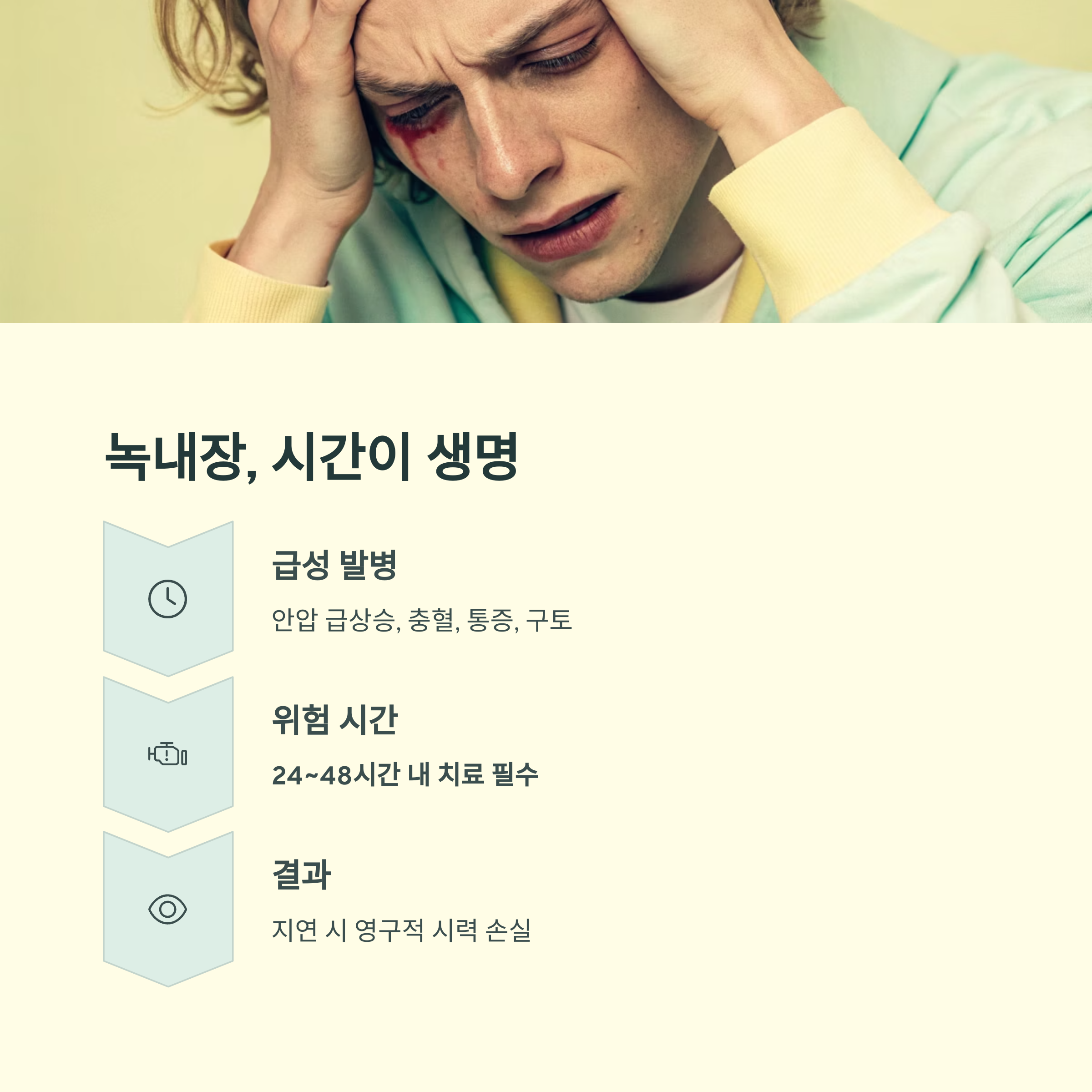 | 급성 녹내장 시 실명 위험 | 24~48시간 내 영구 실명 |