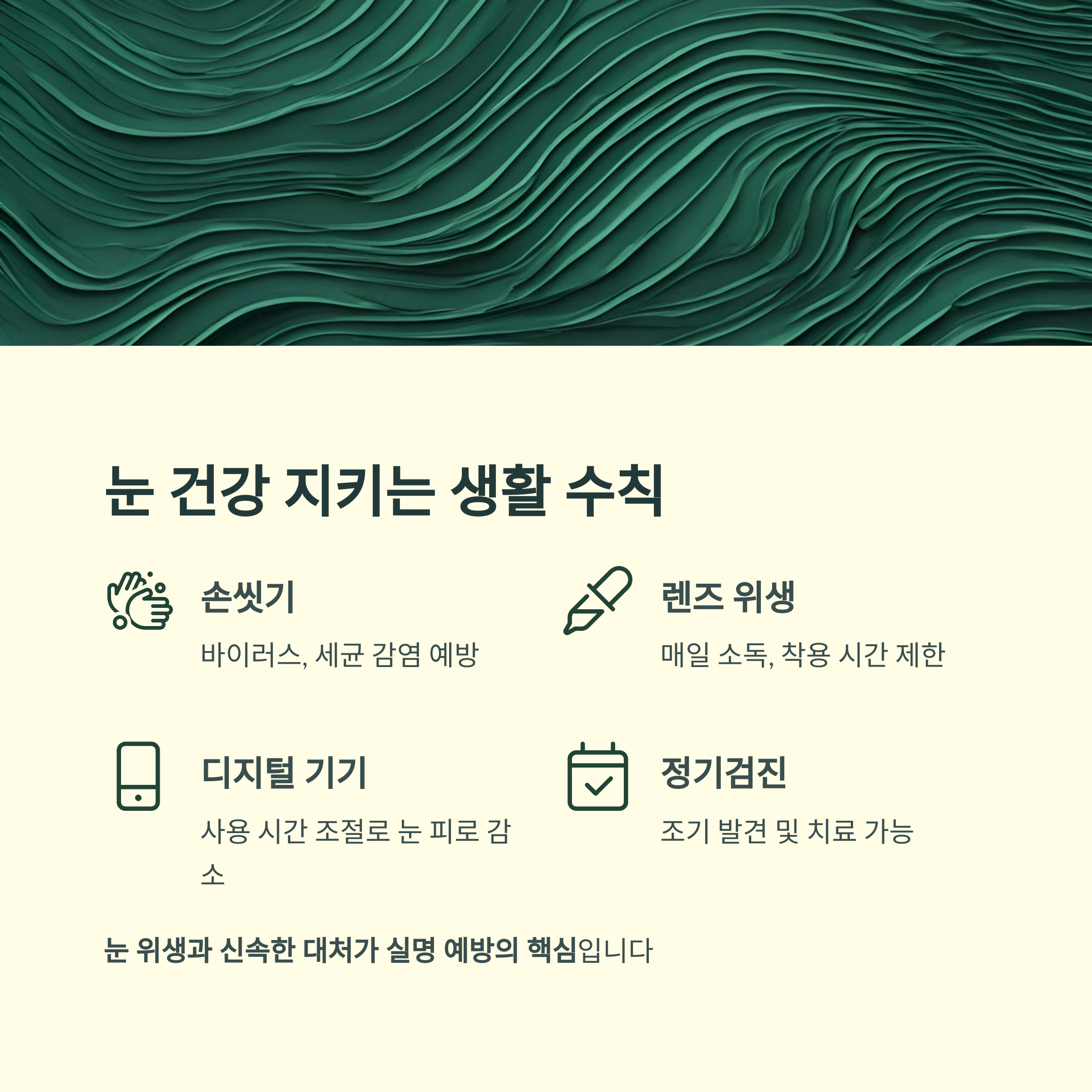 눈 위생을 지키고 의심 증상에 신속히 대처하는 것이 실명 예방의 핵심입니다.