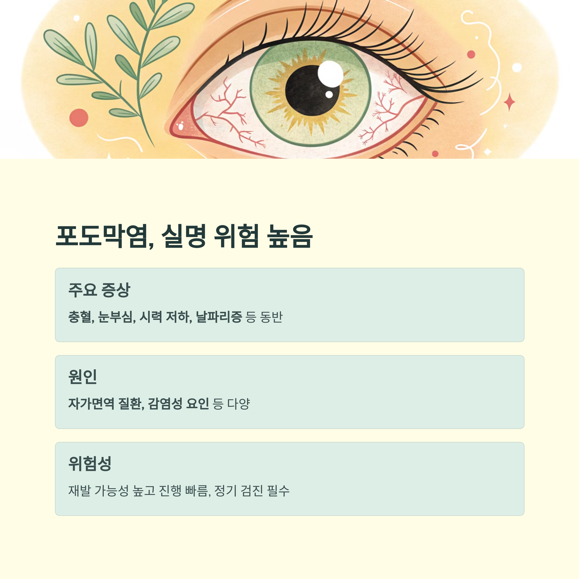 | 포도막염 시력 저하율 | 10~20%, 방치 시 실명 가능 |