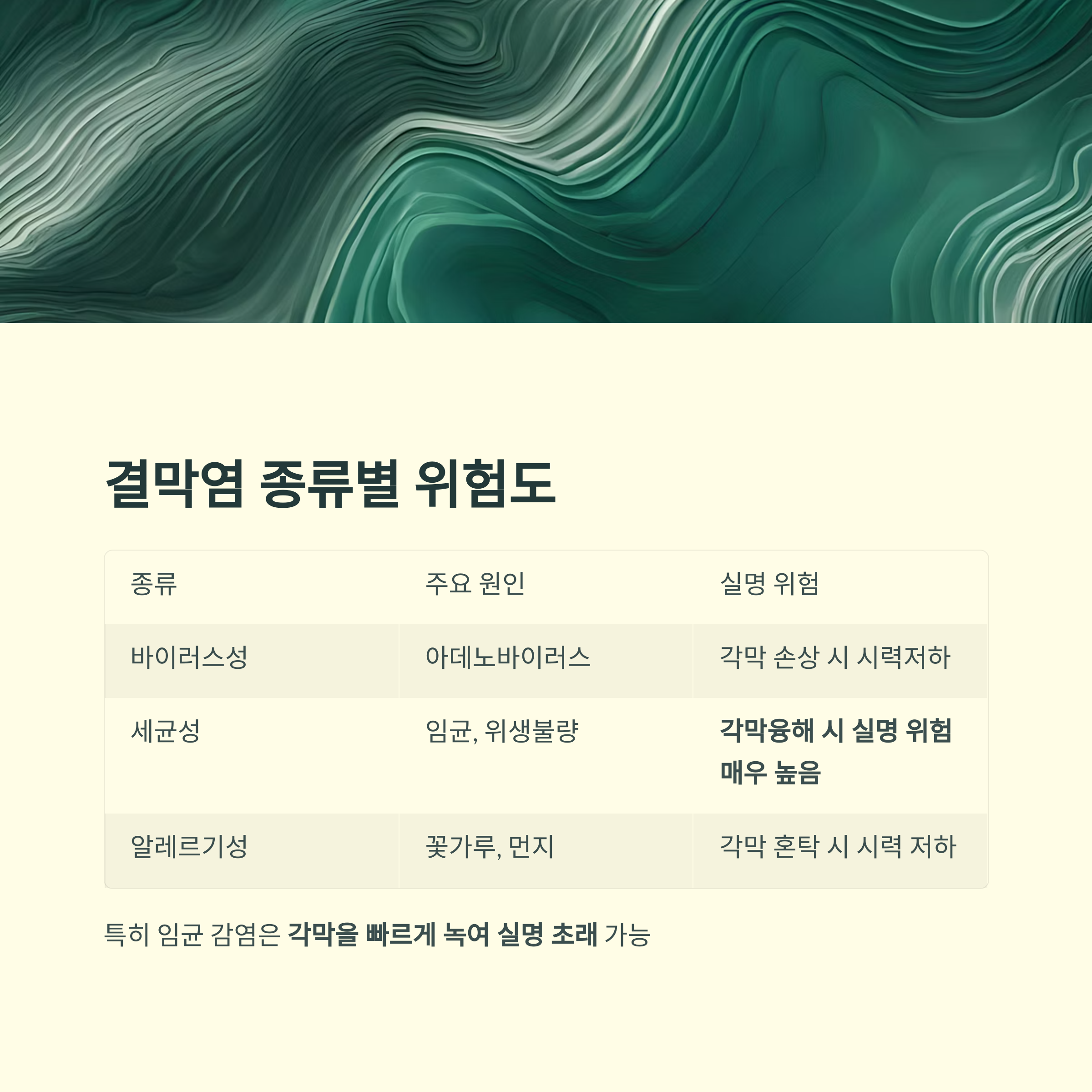 | 세균성 | 임균, 위생불량 등 | 각막융해 시 실명 위험 매우 높음 |