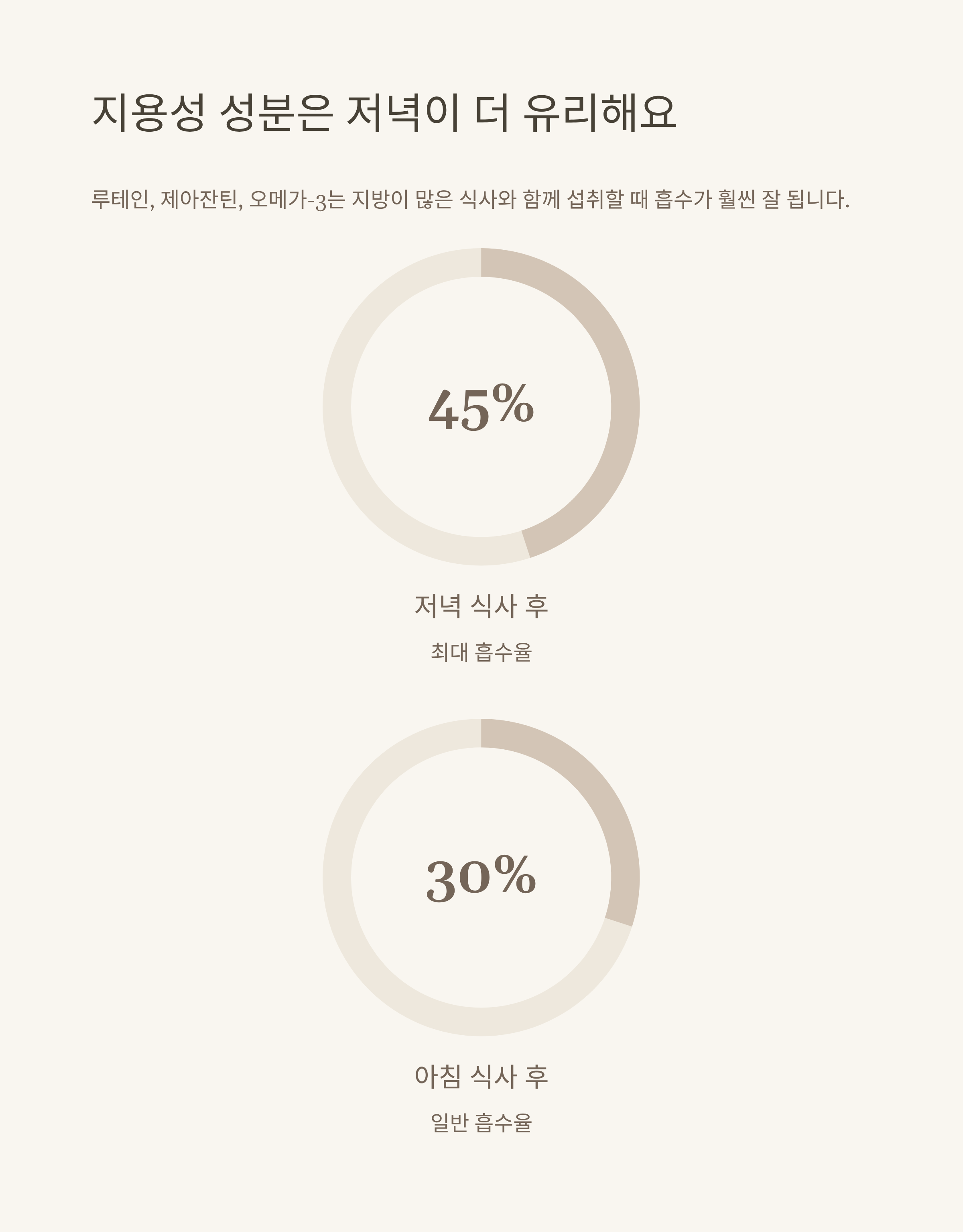 루테인, 제아잔틴, 오메가-3 같은 지용성 성분은 지방이 많은 식사와 함께 섭취할 때 흡수가 훨씬 잘 됩니다.