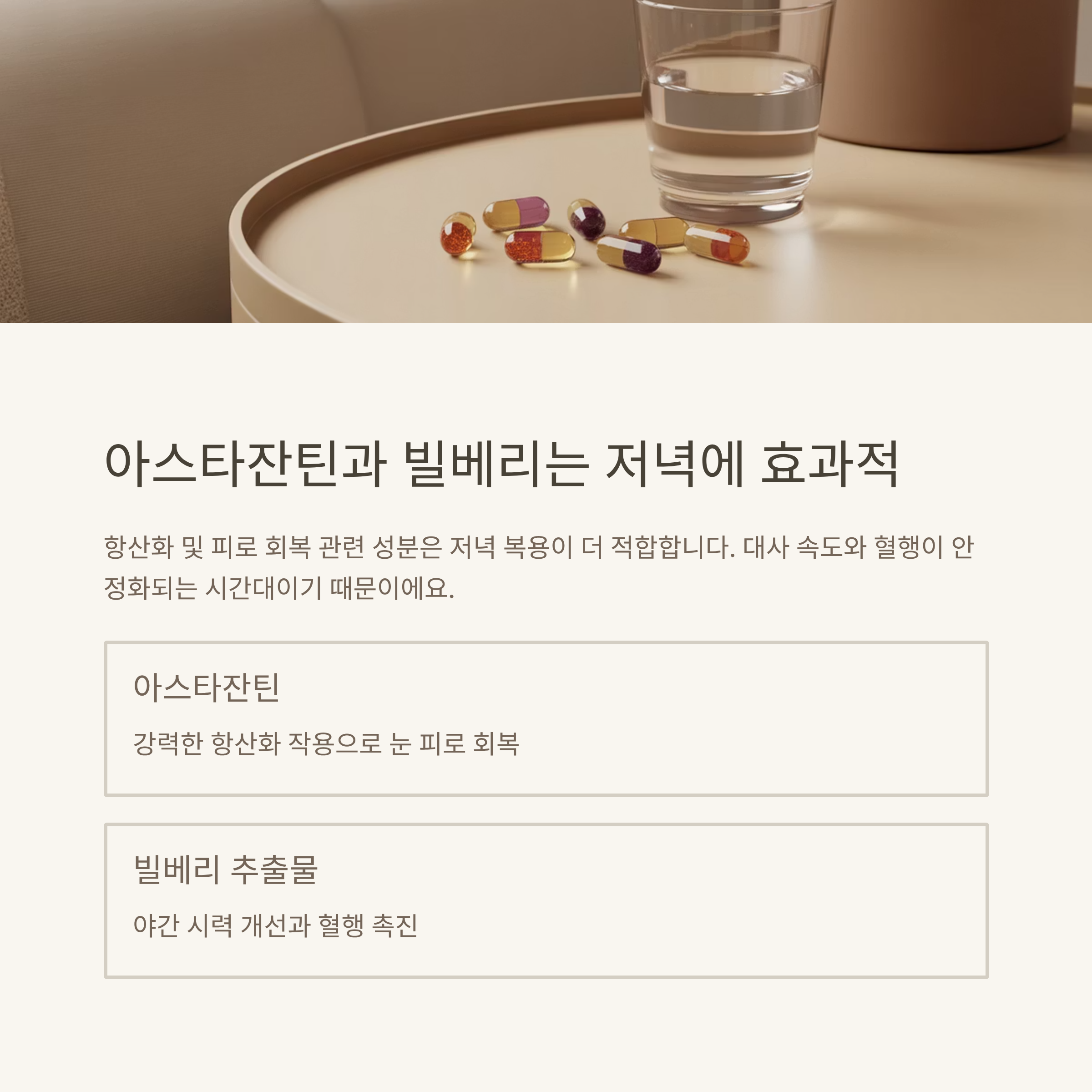 아스타잔틴과 빌베리 추출물처럼 항산화 및 피로 회복 관련 성분은 저녁 복용이 더 적합합니다.