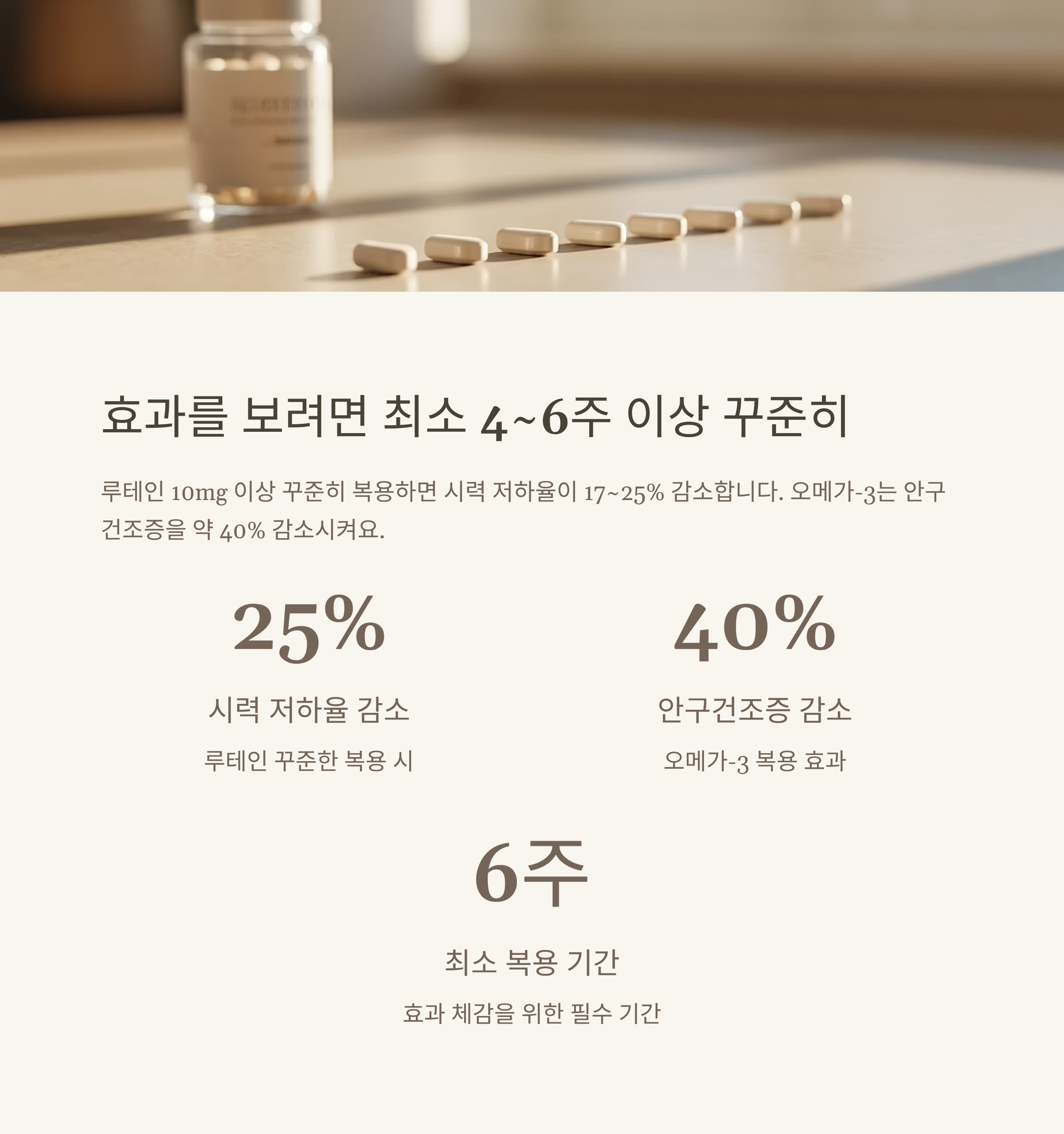 오메가-3는 안구건조증 감소율이 약 40%에 달할 만큼 효과가 입증됐죠. 하지만 이러한 효과는 짧게 먹는다고 생기지 않아요. 최소 4주~6주 이상 복용해야 효과가 체감됩니다.