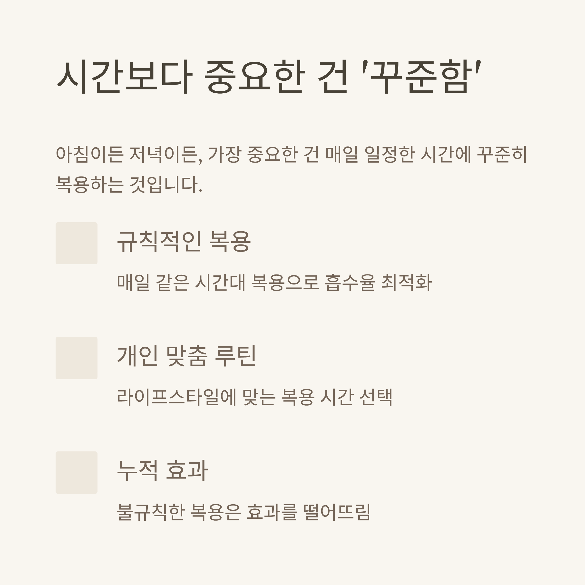 아침이든 저녁이든, 가장 중요한 건 매일 일정한 시간에 꾸준히 복용하는 것입니다.