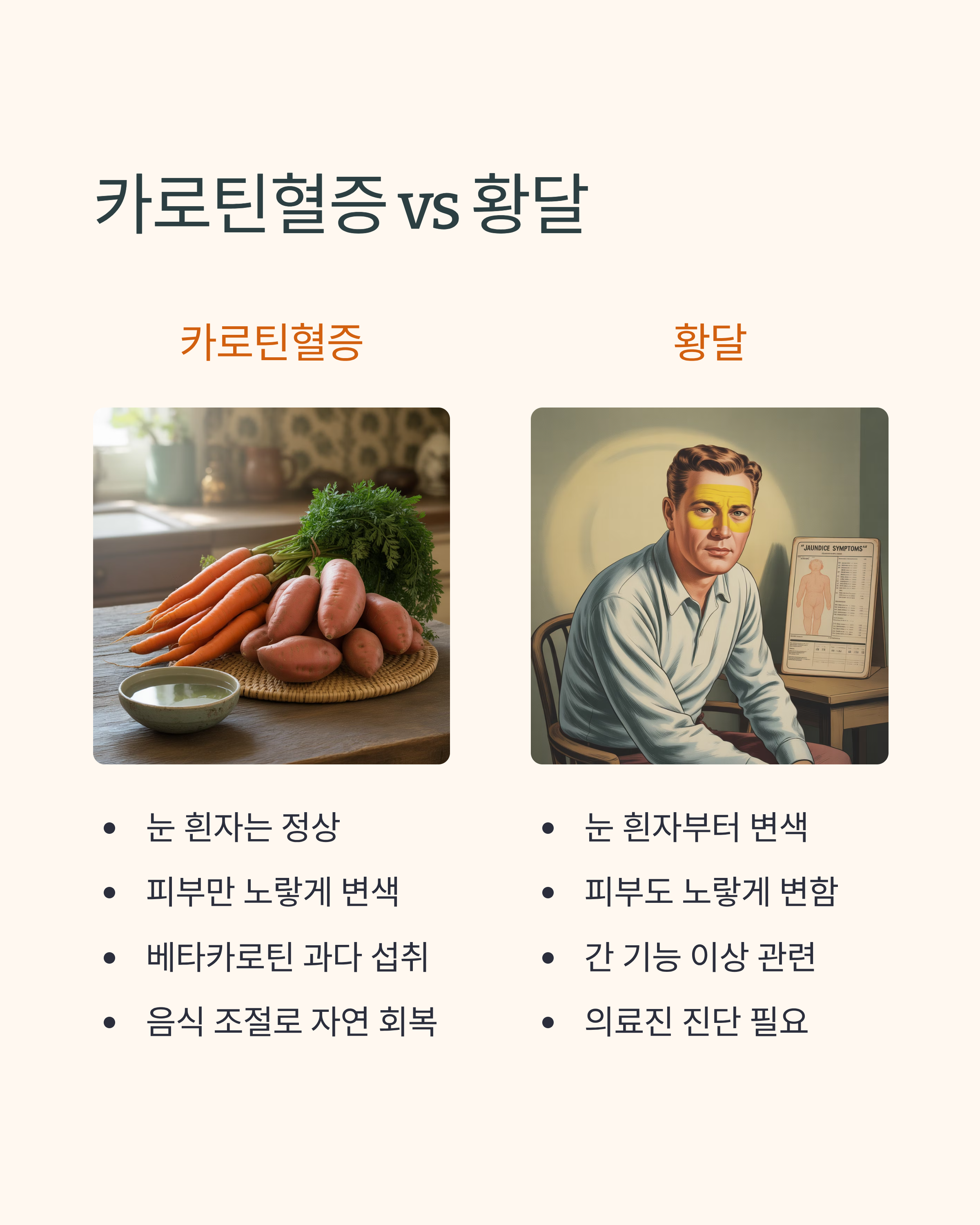 눈 흰자가 하얀데 피부만 노랗다면, 황달보다는 '카로틴혈증'일 가능성이 큽니다.