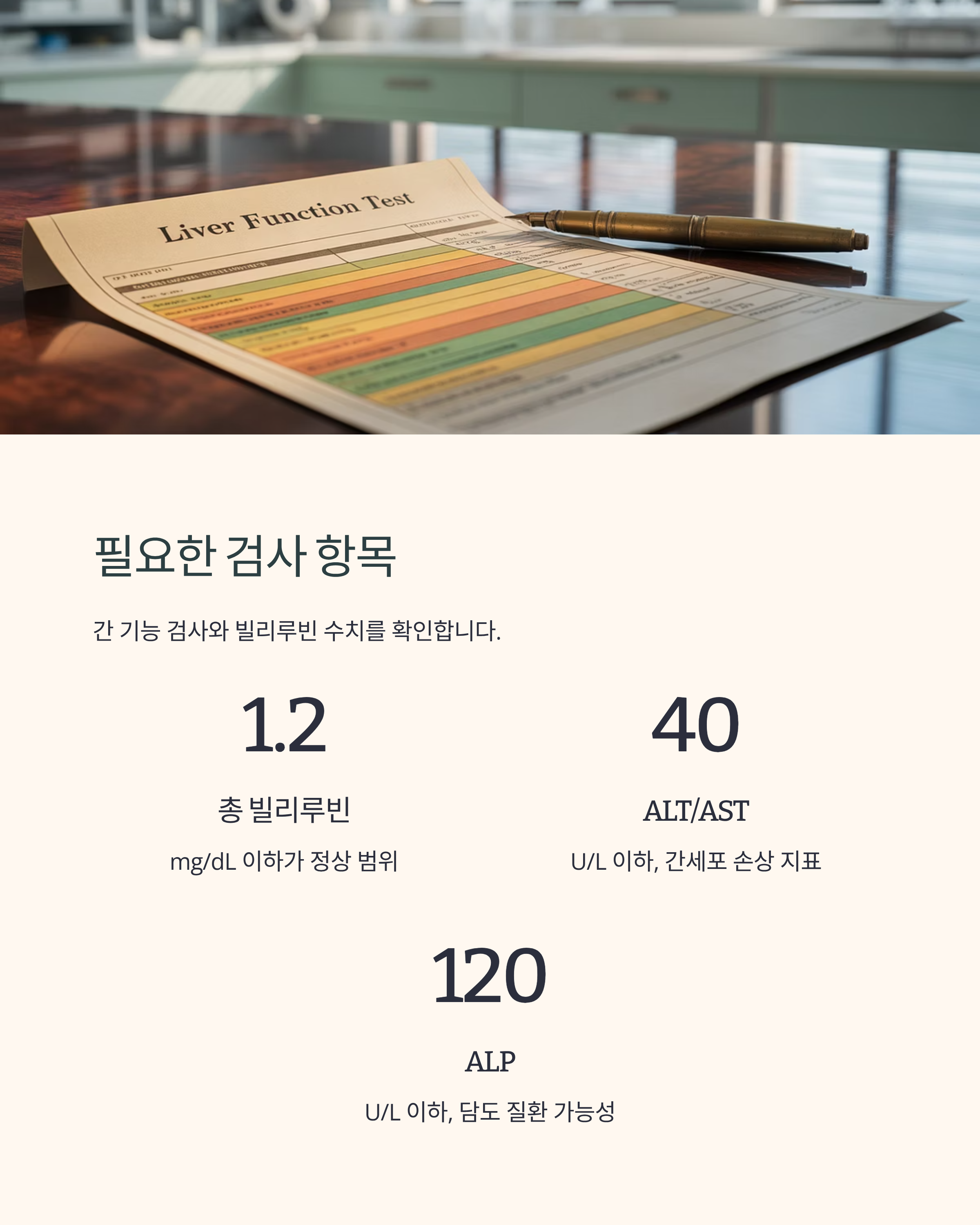 기본적으로는 간 기능 검사와 함께 총 빌리루빈 수치를 확인합니다.