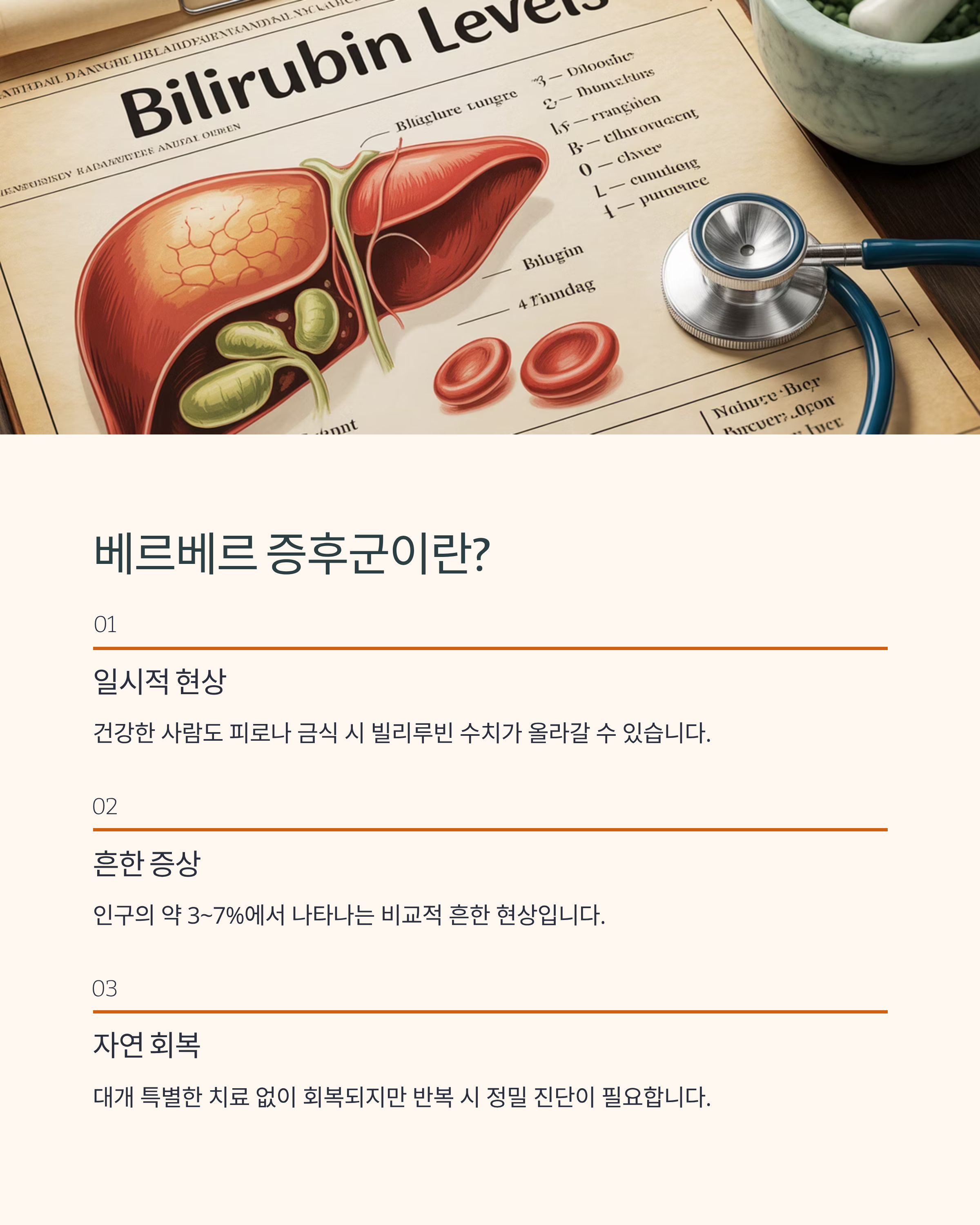 간 기능이 정상인데도 빌리루빈 수치가 일시적으로 올라갈 수 있는 '베르베르 증후군'처럼 혼동하기 쉬운 경우도 있어요.