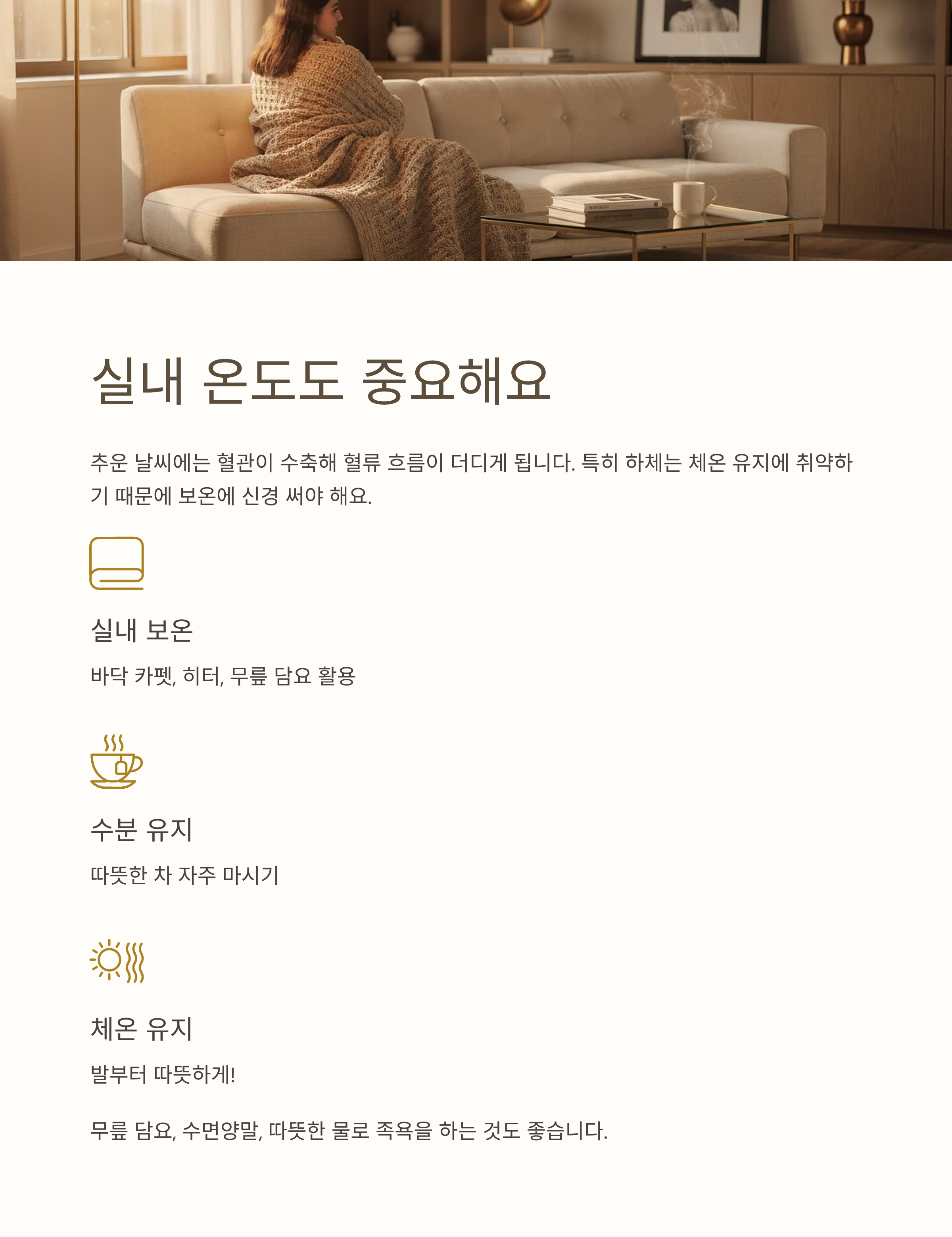 추운 날씨에는 혈관이 수축해 혈류 흐름이 더디게 됩니다. 특히 하체는 체온 유지에 취약하기 때문에 보온에 신경 써야 해요.