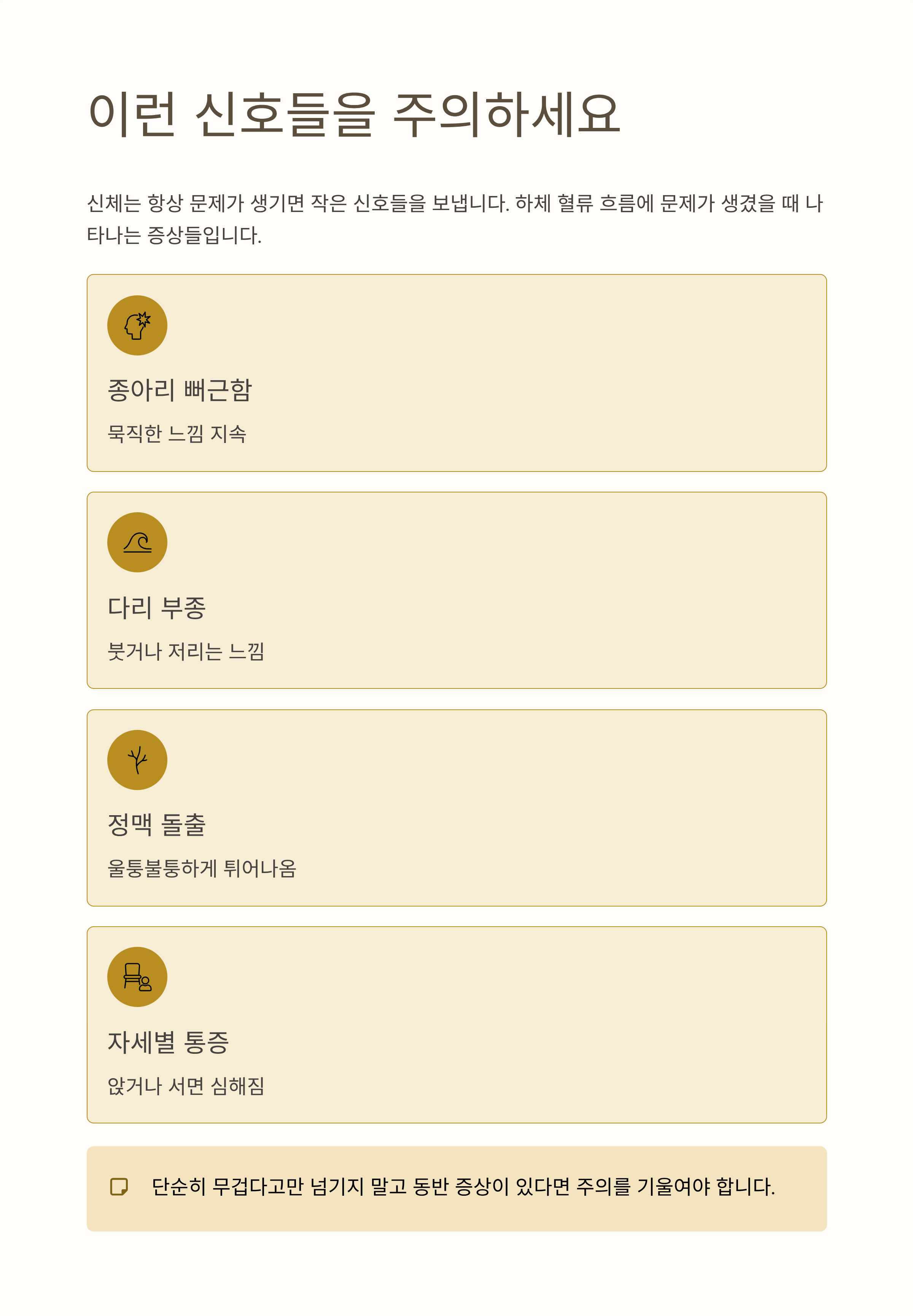 신체는 항상 어떤 문제가 생기면 작은 신호들을 보내죠. 특히 하체 혈류 흐름에 문제가 생겼을 때 이런 증상들이 보일 수 있습니다.