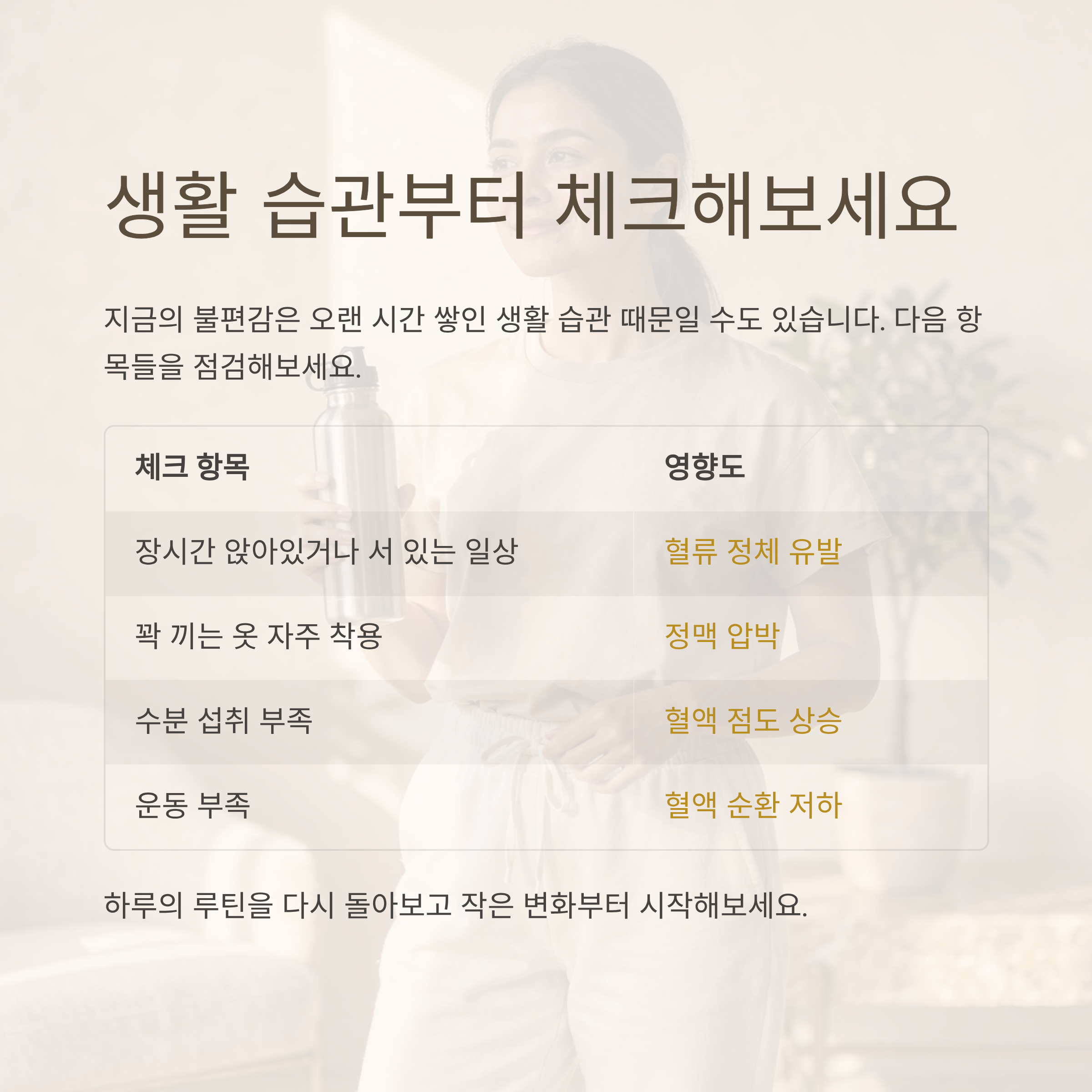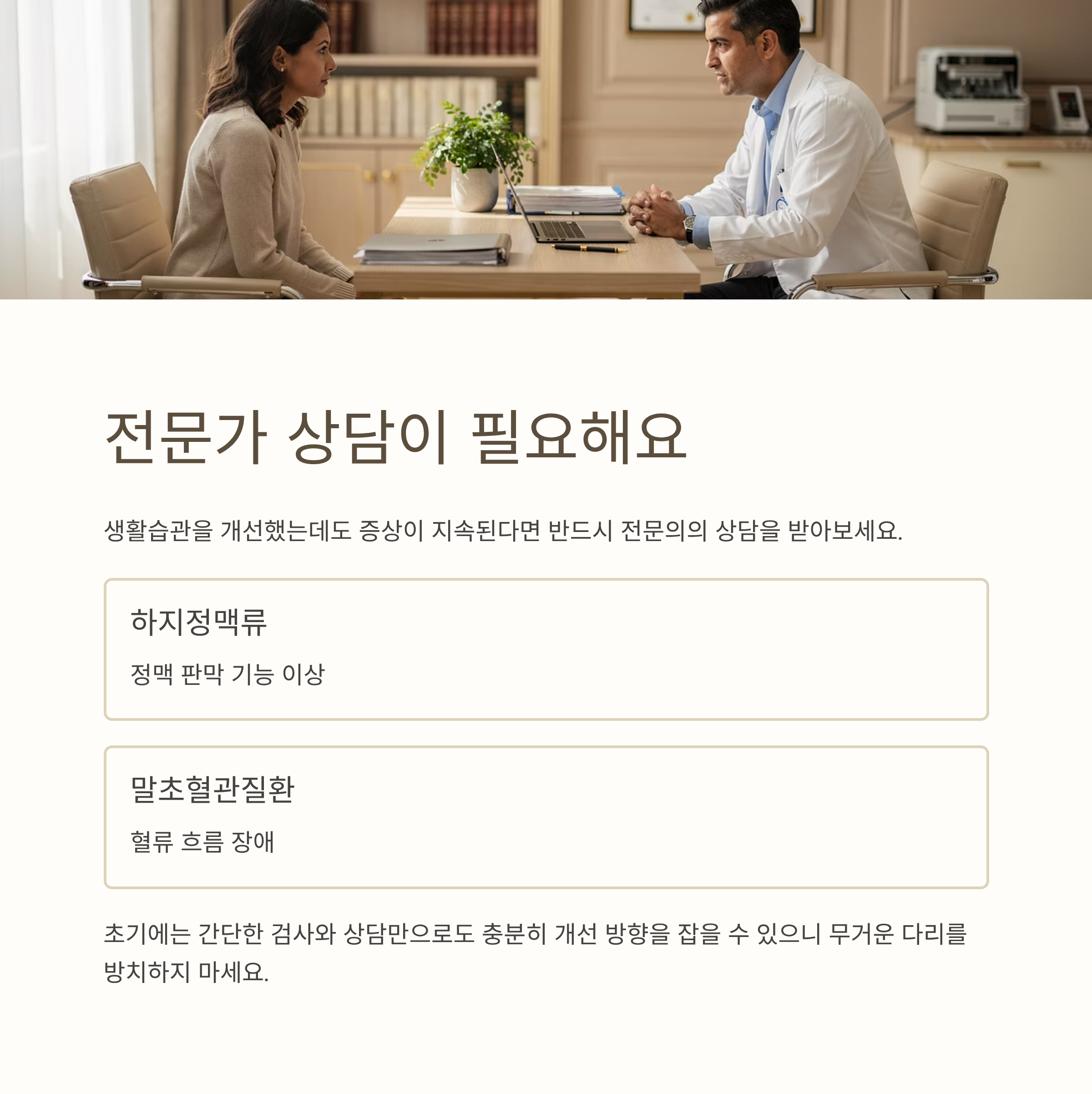생활습관을 개선했는데도 증상이 지속된다면 반드시 전문의의 상담을 받아보세요. 하지정맥류, 말초혈관질환 등 다양한 혈류 문제와 관련된 질환일 수 있습니다.