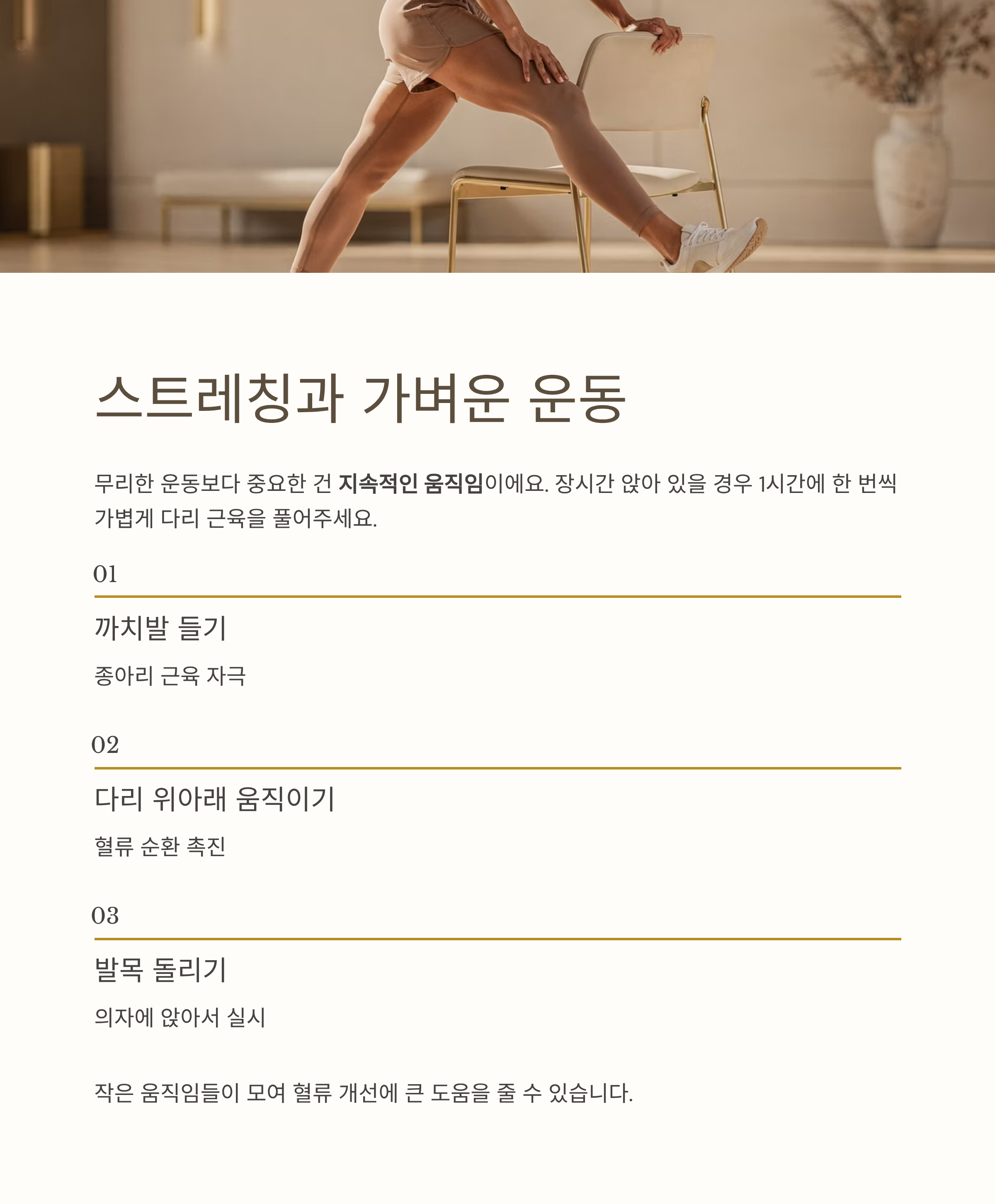 무리한 운동보다 중요한 건 지속적인 움직임이에요. 장시간 앉아 있을 경우에는 1시간에 한 번씩 일어나 가볍게 다리 근육을 풀어주는 스트레칭을 해주세요.