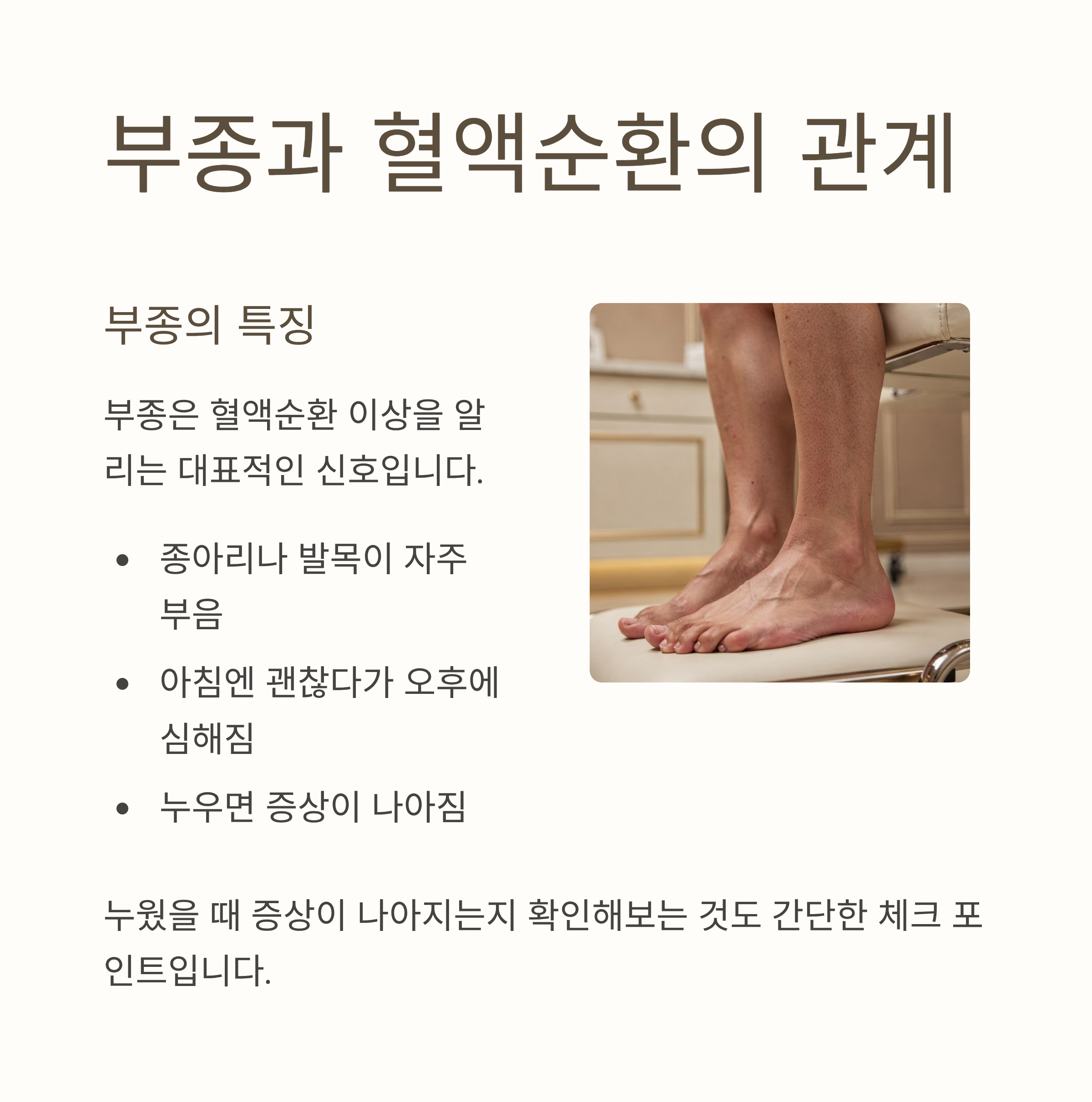 부종은 혈액순환 이상을 알리는 대표적인 신호입니다. 특히 종아리나 발목이 자주 붓고, 아침에 일어나면 괜찮다가 오후에 갈수록 심해진다면 정맥 순환 문제를 의심할 수 있어요.