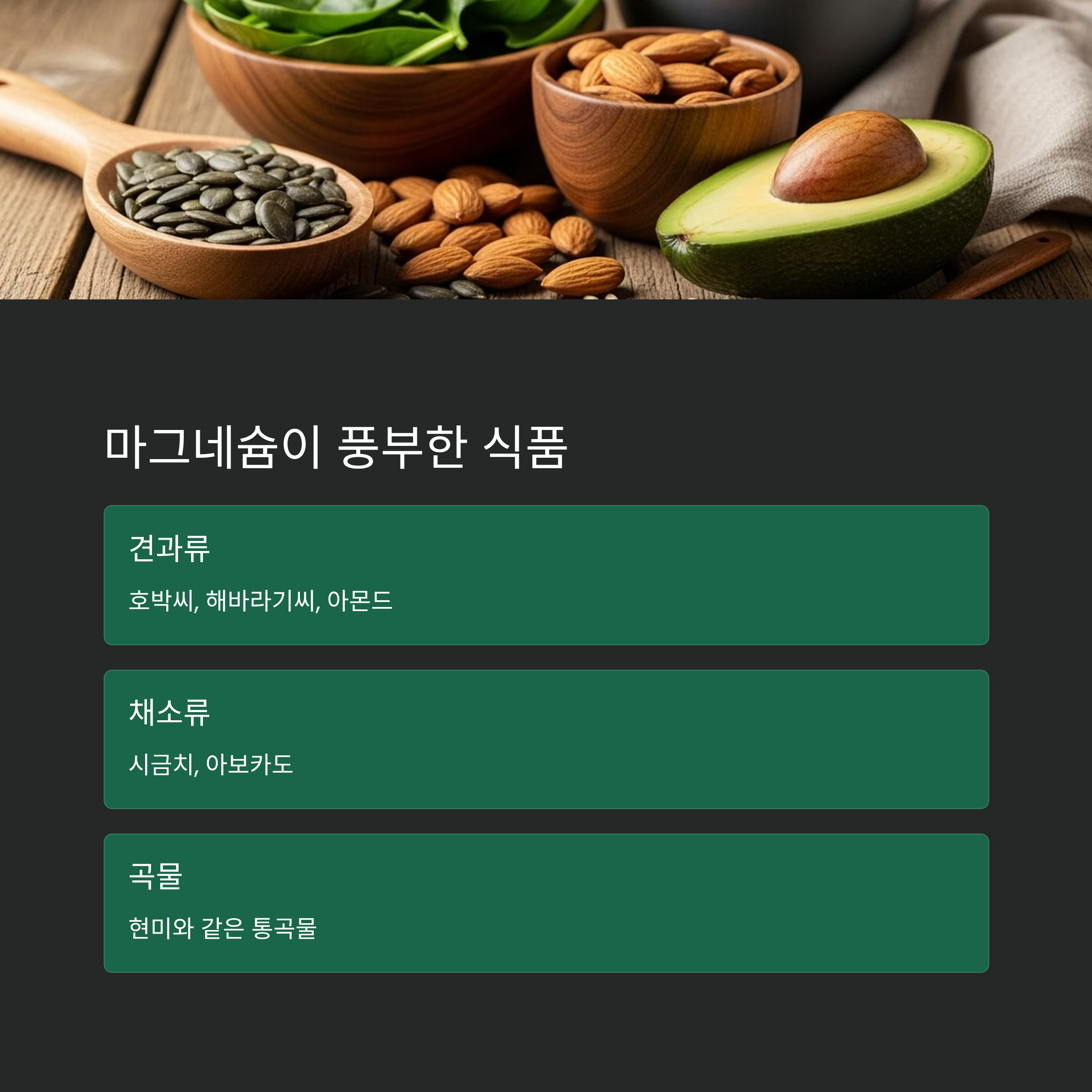 호박씨, 해바라기씨, 아몬드, 시금치, 아보카도 등이 있고