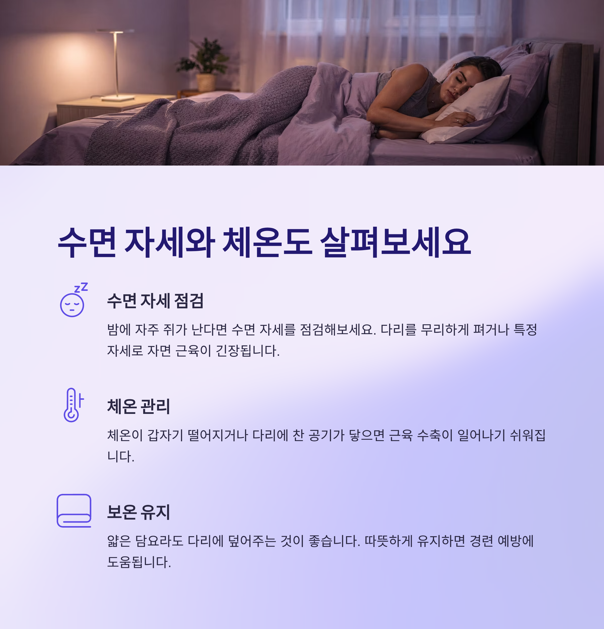 또한 체온이 갑자기 떨어지거나 다리에 찬 공기가 닿으면 근육 수축이 일어나기 쉬워지므로, 얇은 담요라도 다리에 덮어주는 것이 좋습니다.