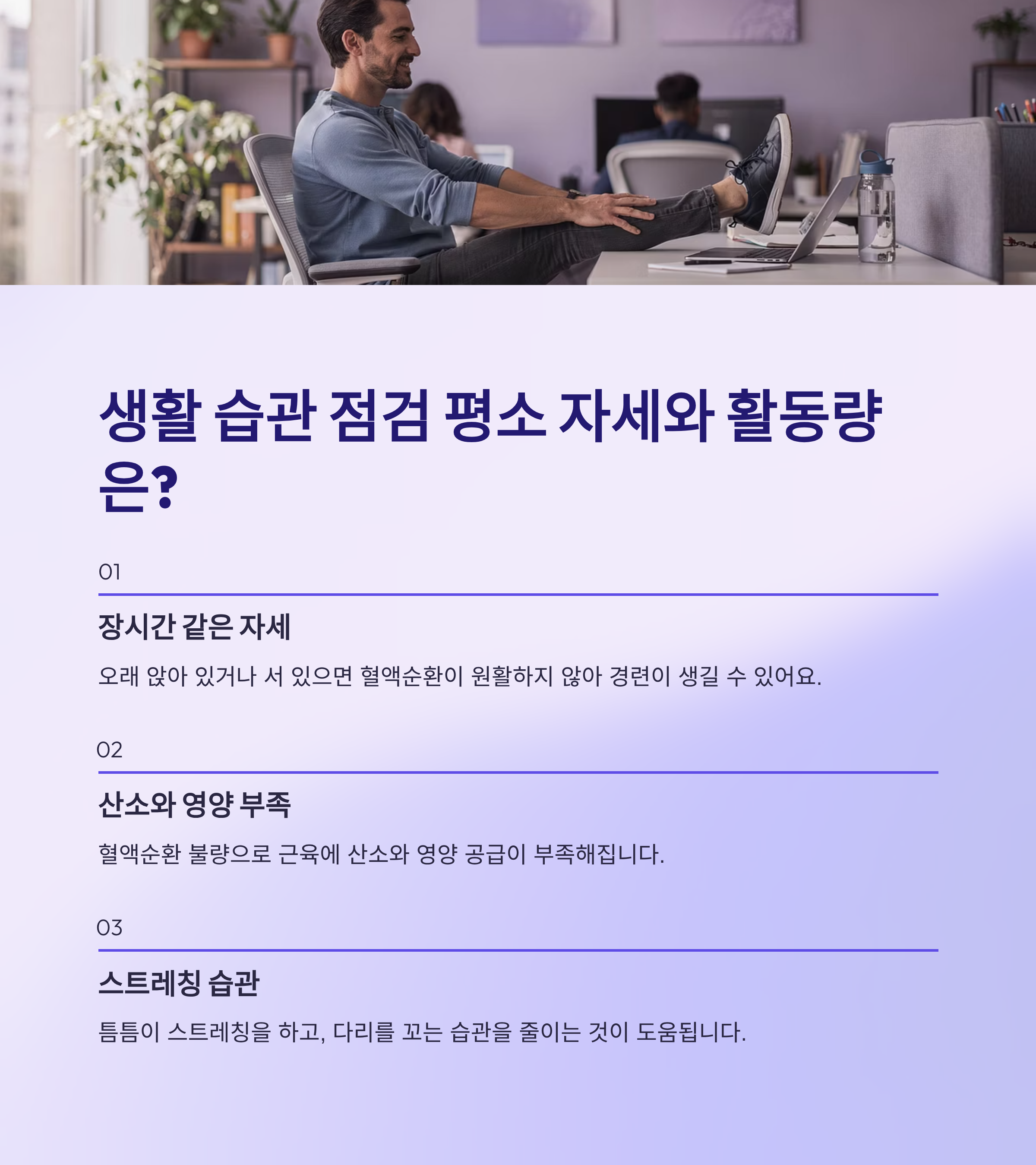 혈액순환이 원활하지 않으면 근육에 산소와 영양 공급이 부족해져 경련이 생길 수 있거든요.