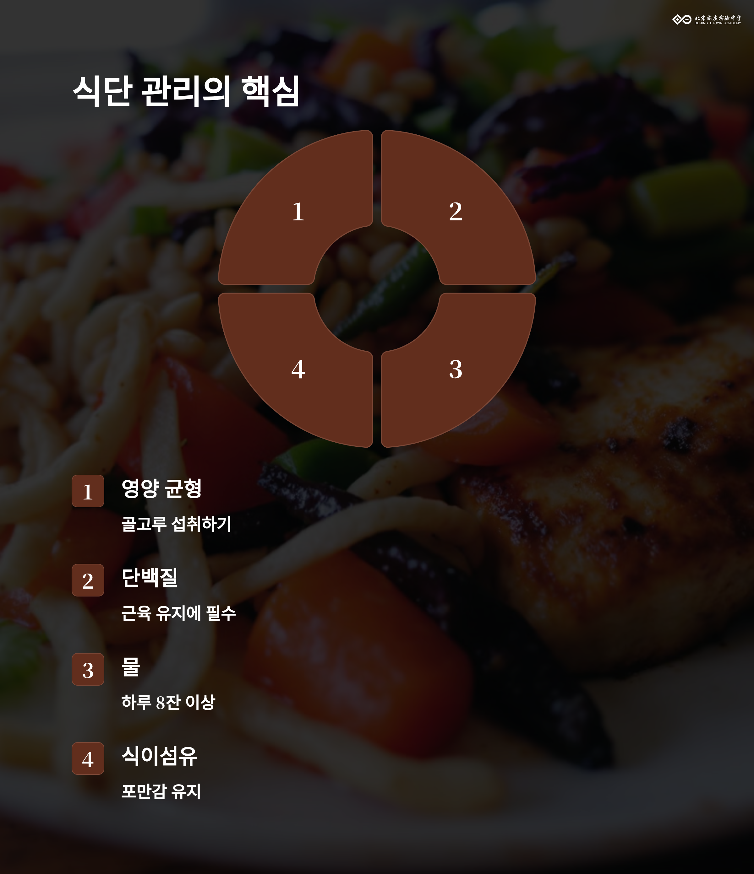 | 균형 잡힌 식단 | 다이어트에서 중요한 것은 칼로리 섭취를 줄이는 것뿐만 아니라, 영양소가 균형 있게 포함된 식단을 유지하는 것입니다. |