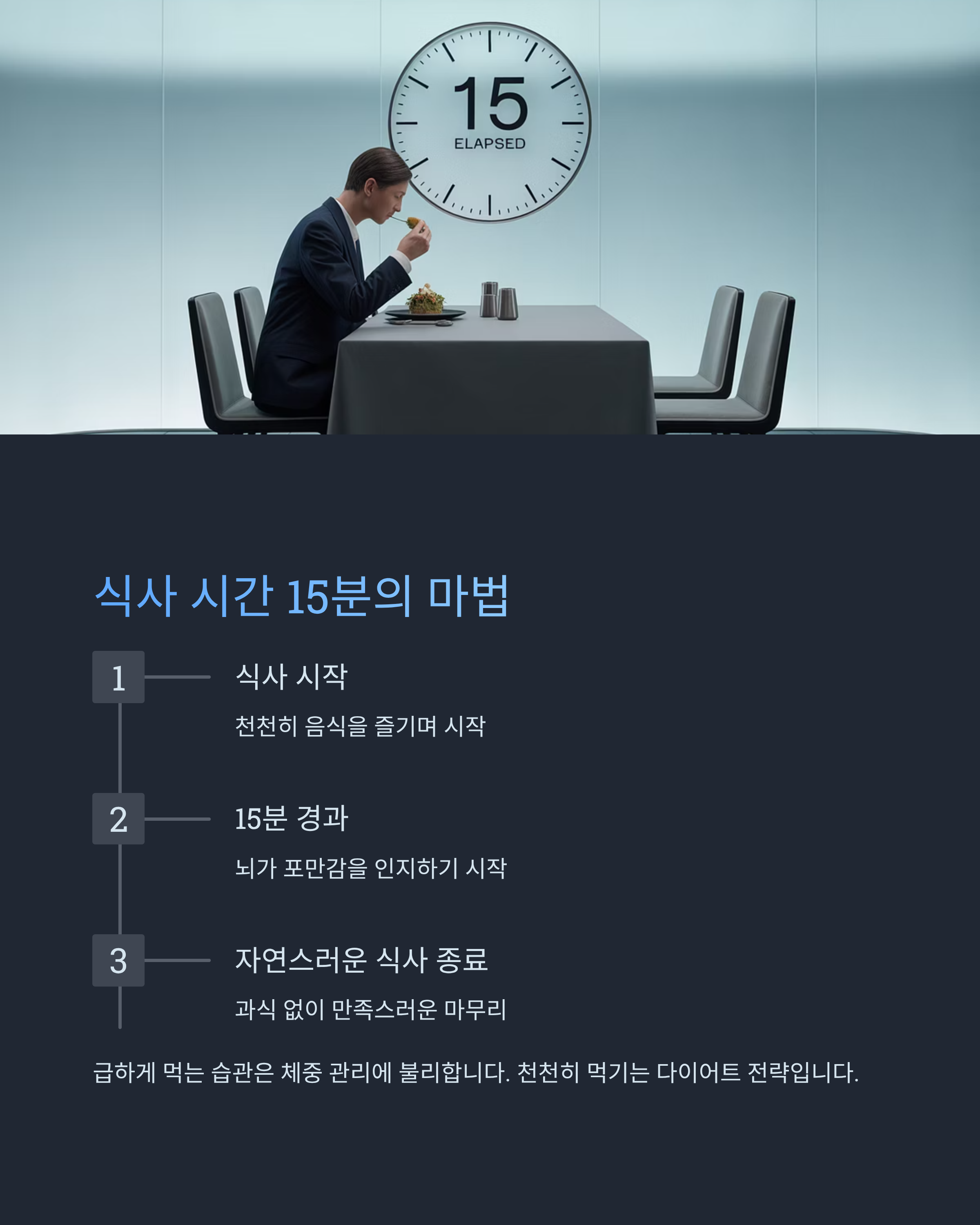 음식을 먹고 난 뒤 포만감은 약 15분 후부터 뇌가 인지하기 시작합니다. 따라서 식사를 천천히 즐기는 습관은 단순한 예절이 아니라 다이어트의 전략이 될 수 있습니다. 급하게 먹는 습관은 체중 관리에 불리하게 작용합니다.