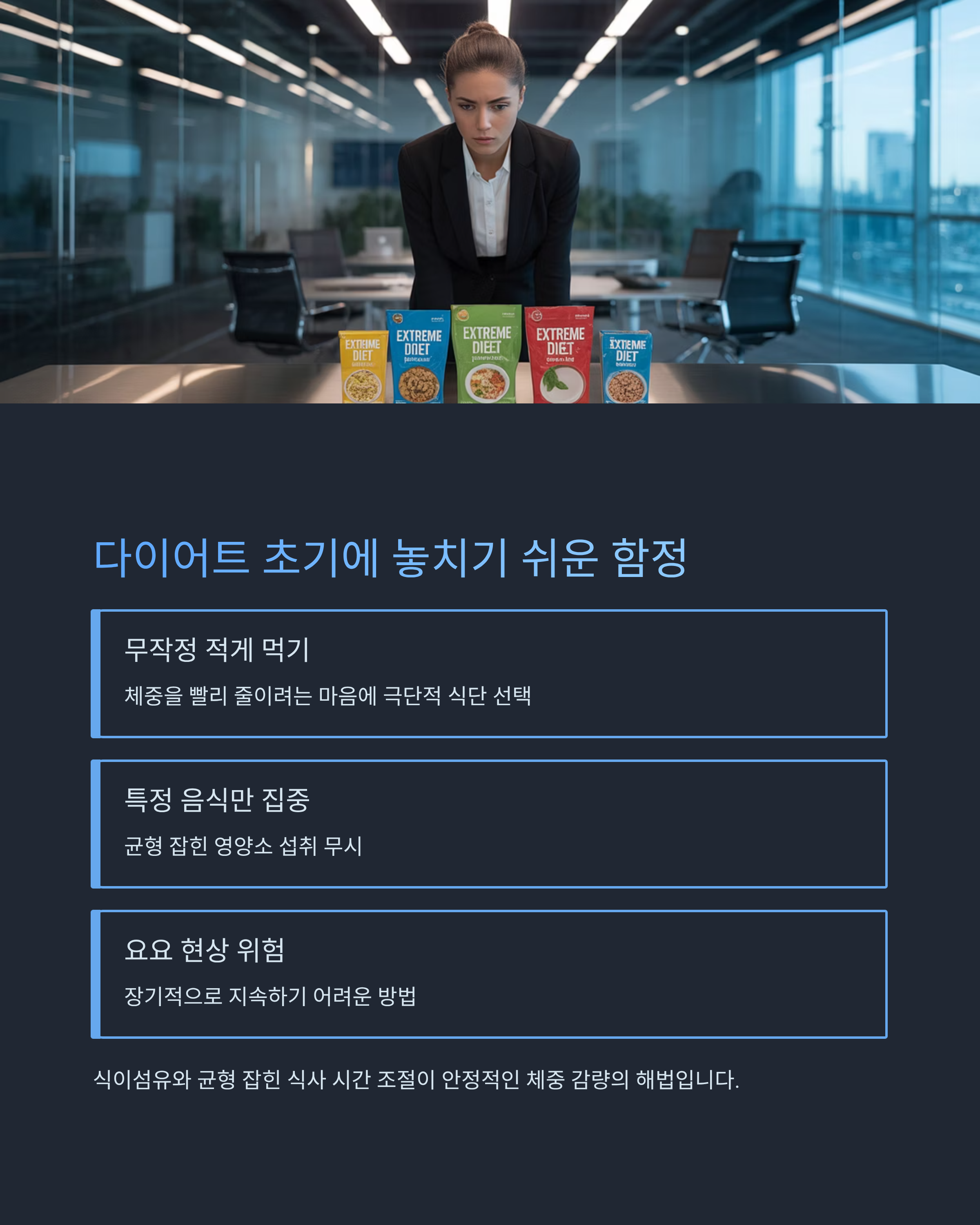 초반에는 체중을 빨리 줄이고 싶은 마음에 무작정 적게 먹거나 특정 음식만 집중적으로 섭취하는 경우가 많습니다. 하지만 이는 장기적으로 지속하기 어렵고, 요요를 부를 가능성이 큽니다. 식이섬유와 균형 잡힌 식사 시간 조절이 안정적인 체중 감량의 해법입니다.