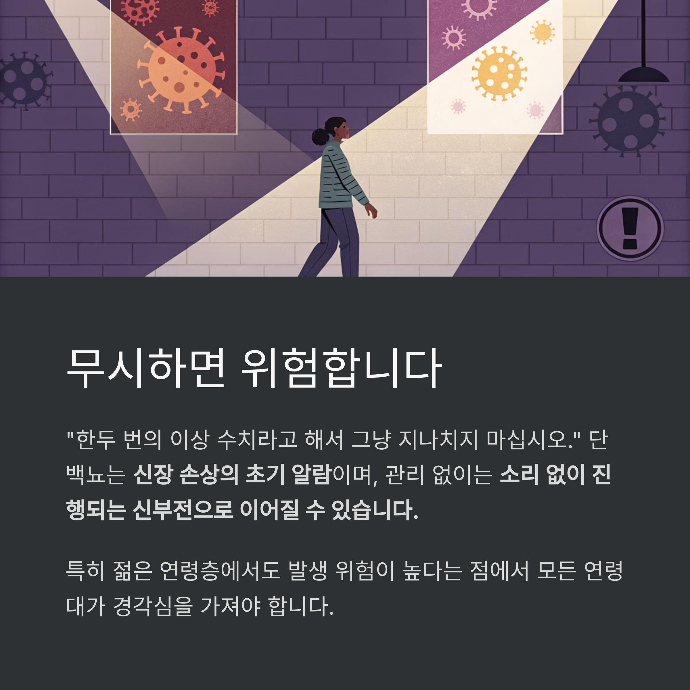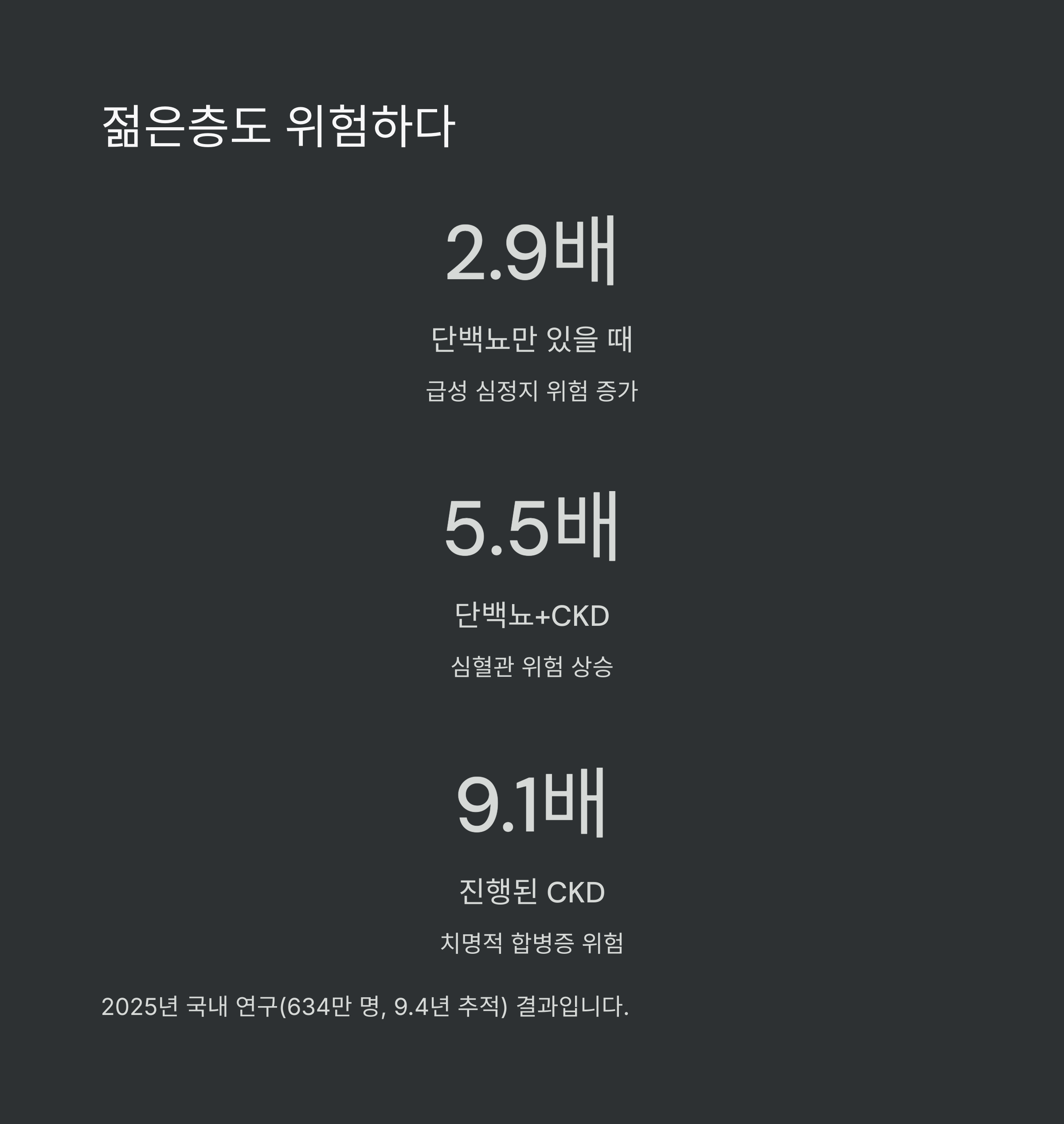 이처럼 단백뇨는 단순한 검사 결과를 넘어서 치명적인 심혈관 합병증의 경고신호입니다