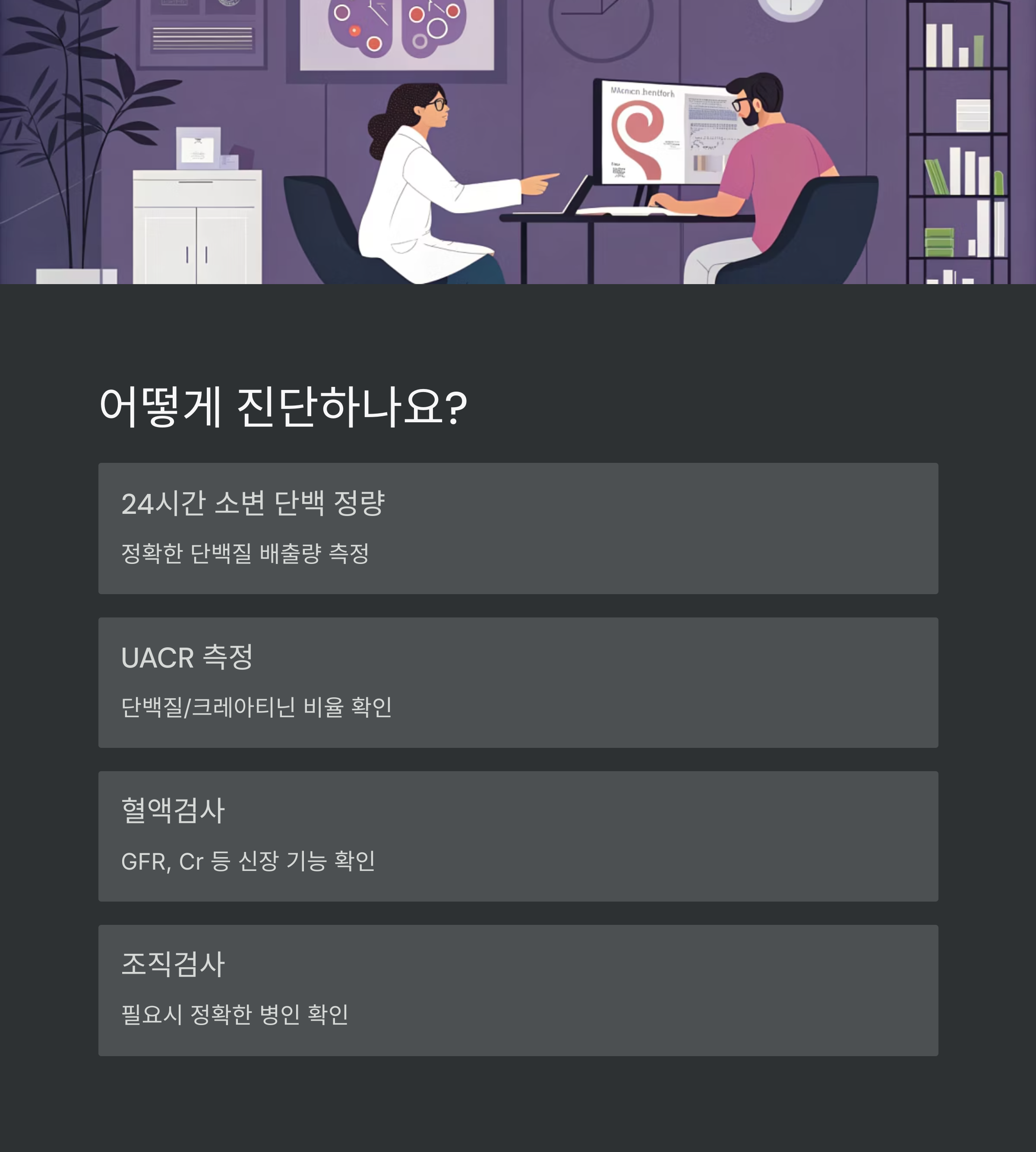 필요 시에는 혈액검사로 신장 기능 수치(GFR, Cr 등)를 확인하거나,