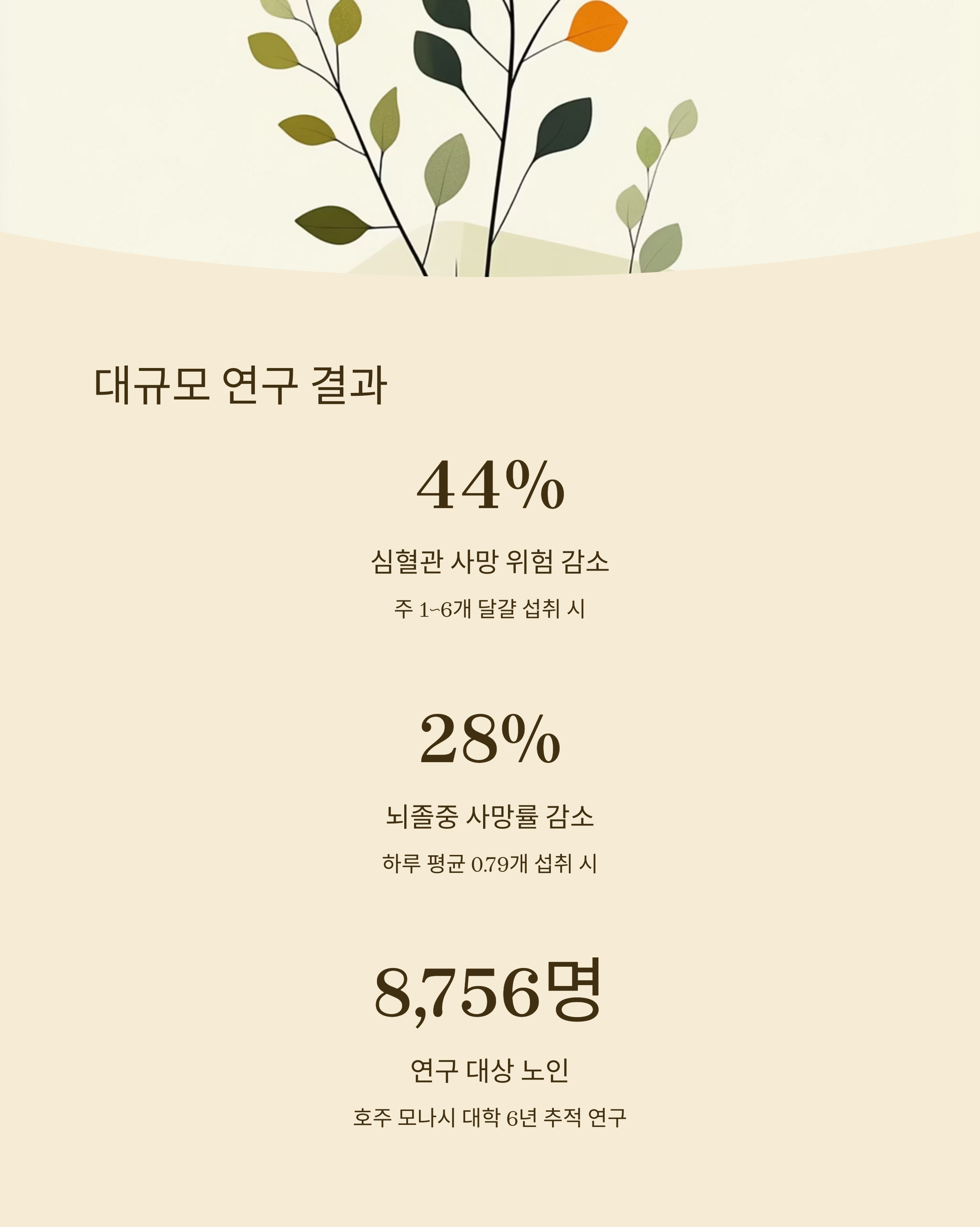 | 모나시 대학 | 70세 이상 노인 8,756명 | 주 1개에서 6개 섭취 시 전체 사망률 ↓, 심혈관 사망률 44% ↓ |