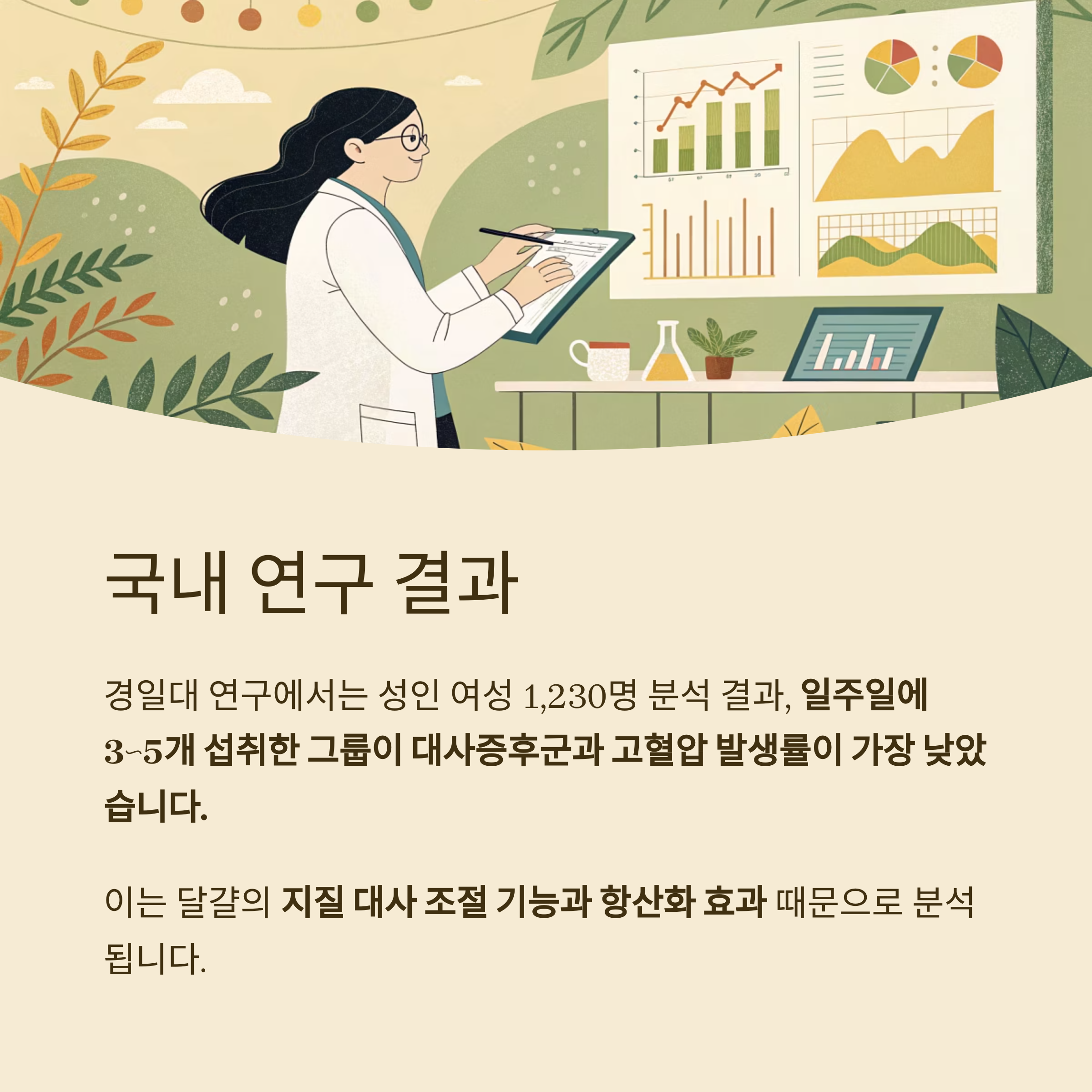 일주일에 3개에서 5개 섭취한 그룹이 대사증후군과 고혈압 발생률이 가장 낮았습니다.