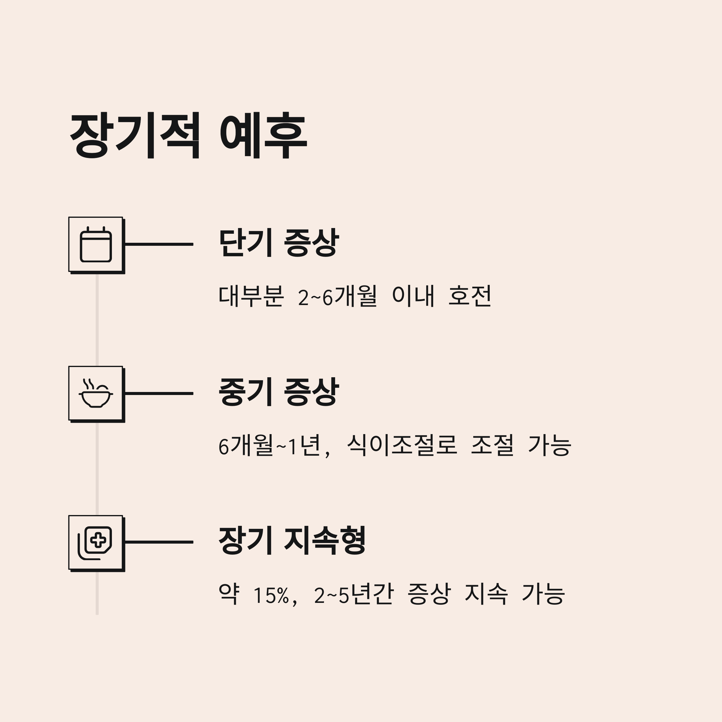 | 단기 증상 | 대부분 2개월에서 6개월 이내 호전 |