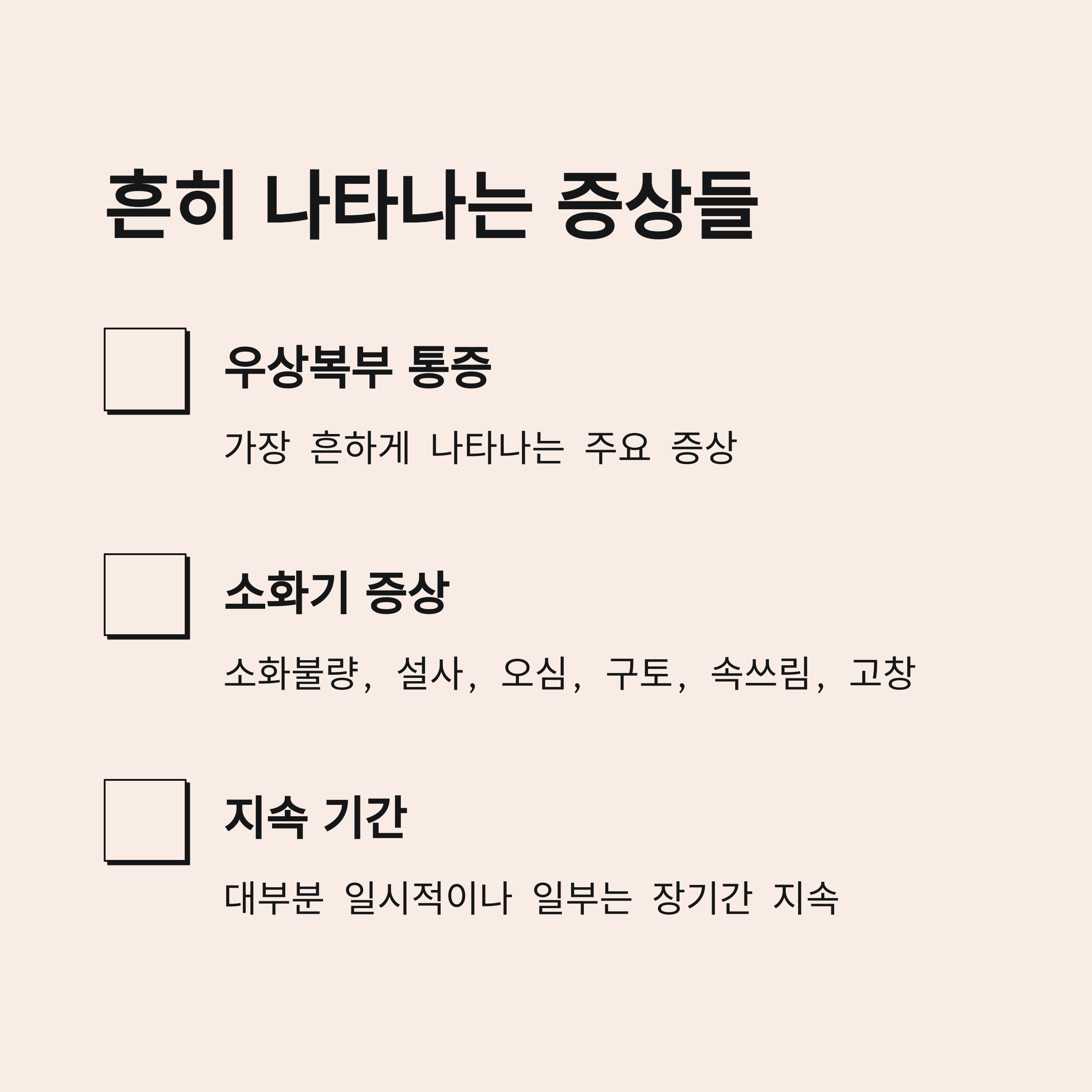 이외에도 소화불량, 설사, 오심, 구토, 속쓰림, 고창 등의 증상이 동반될 수 있습니다.