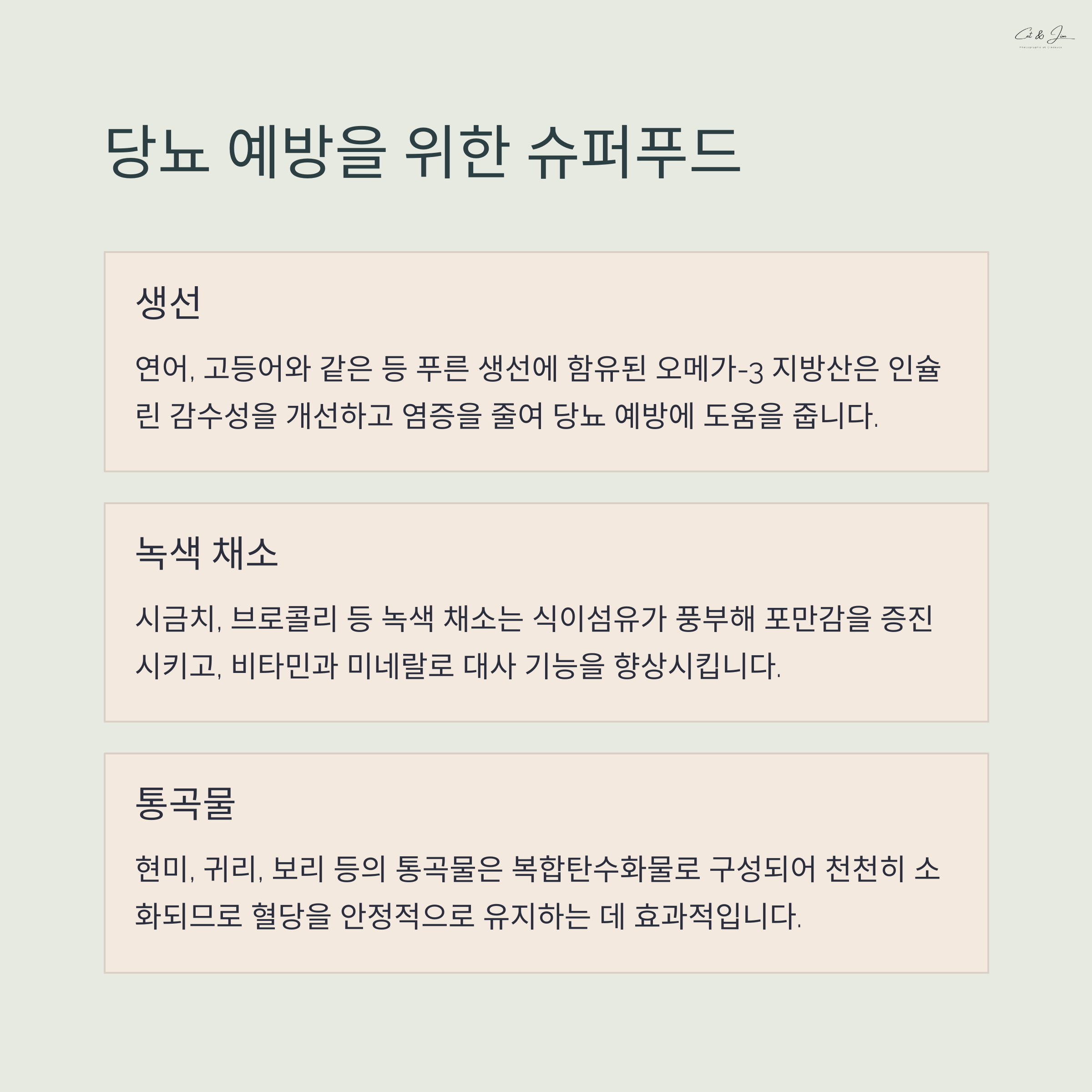 | 잡곡밥, 통밀빵은 혈당을 천천히 올립니다. | 하루 30~60분, 꾸준한 유산소 운동이 효과적입니다. | 시금치, 브로콜리, 견과류가 포함됩니다. |