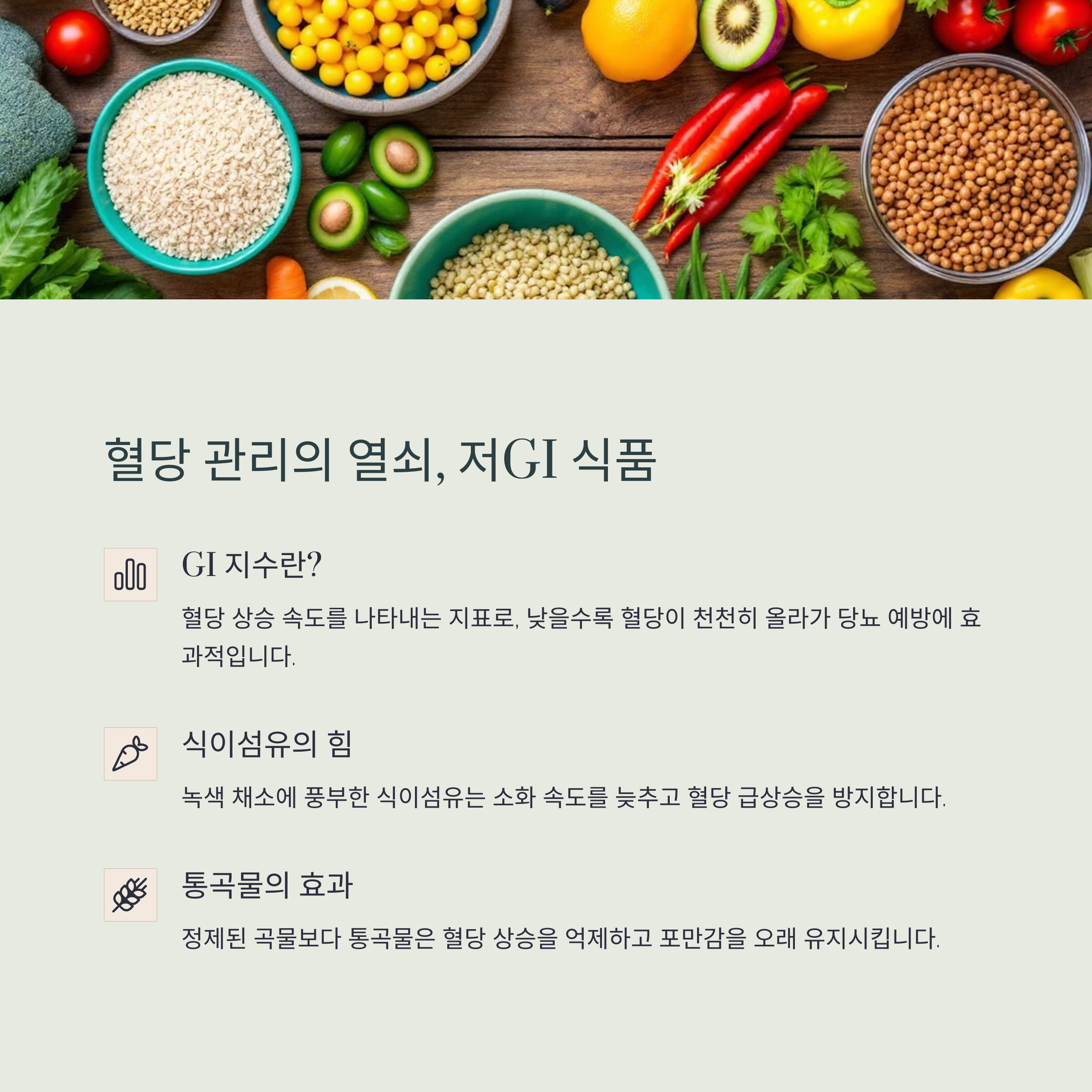 | GI 지수가 낮아 혈당 스파이크 방지에 유리합니다. | 운동 후 인슐린 감수성이 높아집니다. | 식이섬유는 포도당 흡수를 늦추는 역할을 합니다. |