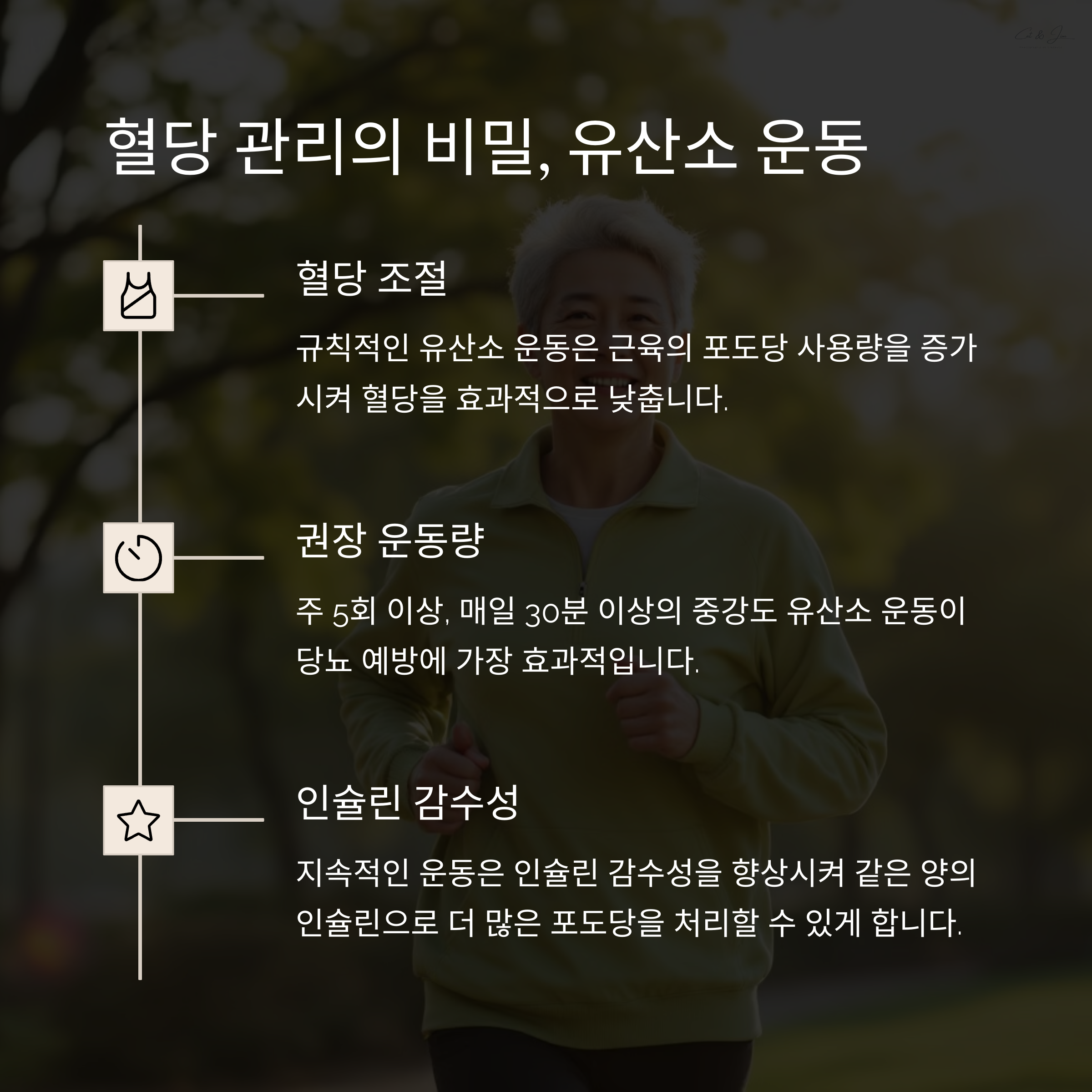 | 운동 시간과 강도 | 하루 30분 걷기, 숨이 찰 정도의 강도가 적당합니다. |