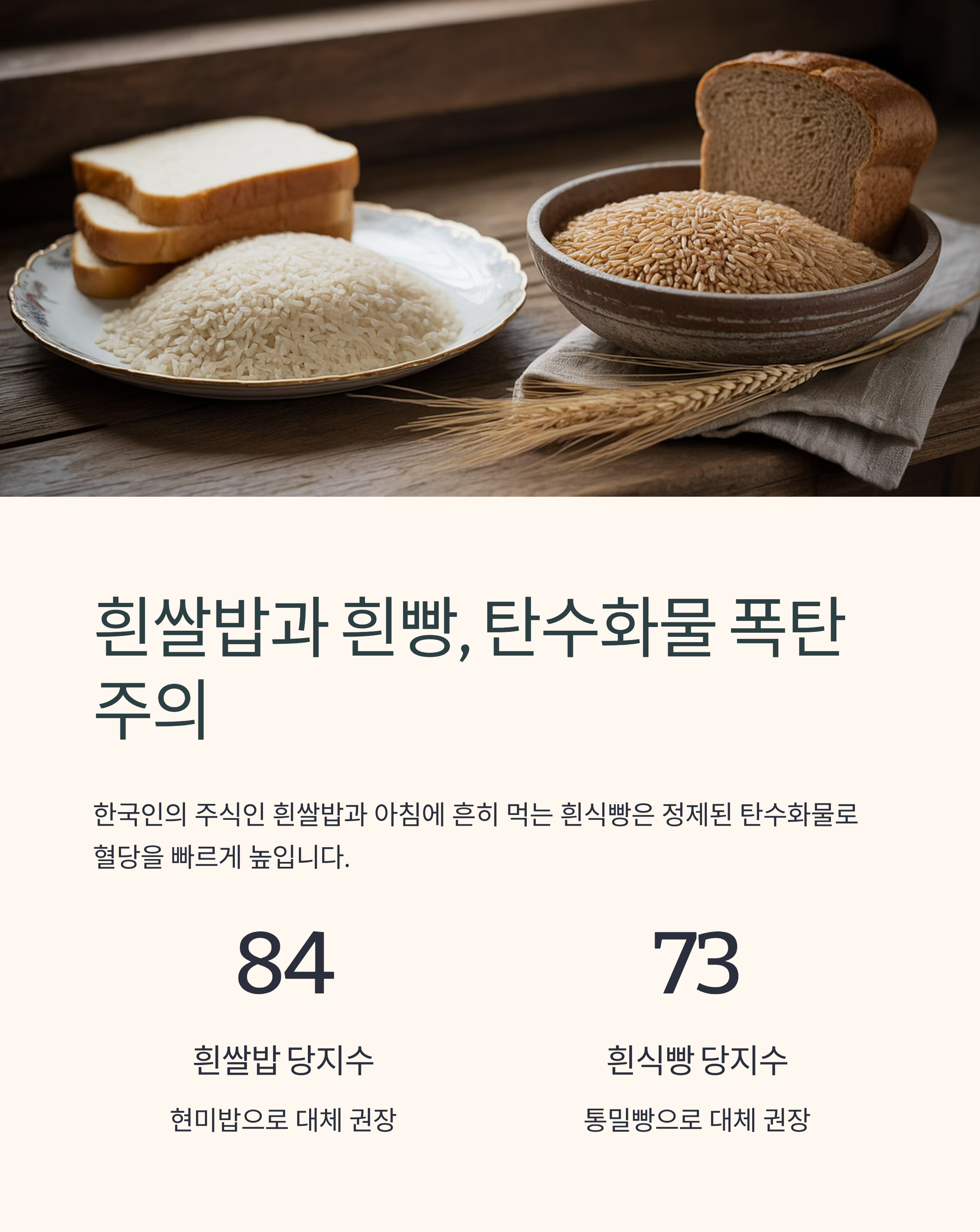 현미밥이나 통밀빵으로 대체하는 것이 혈당 관리에 훨씬 도움이 됩니다.