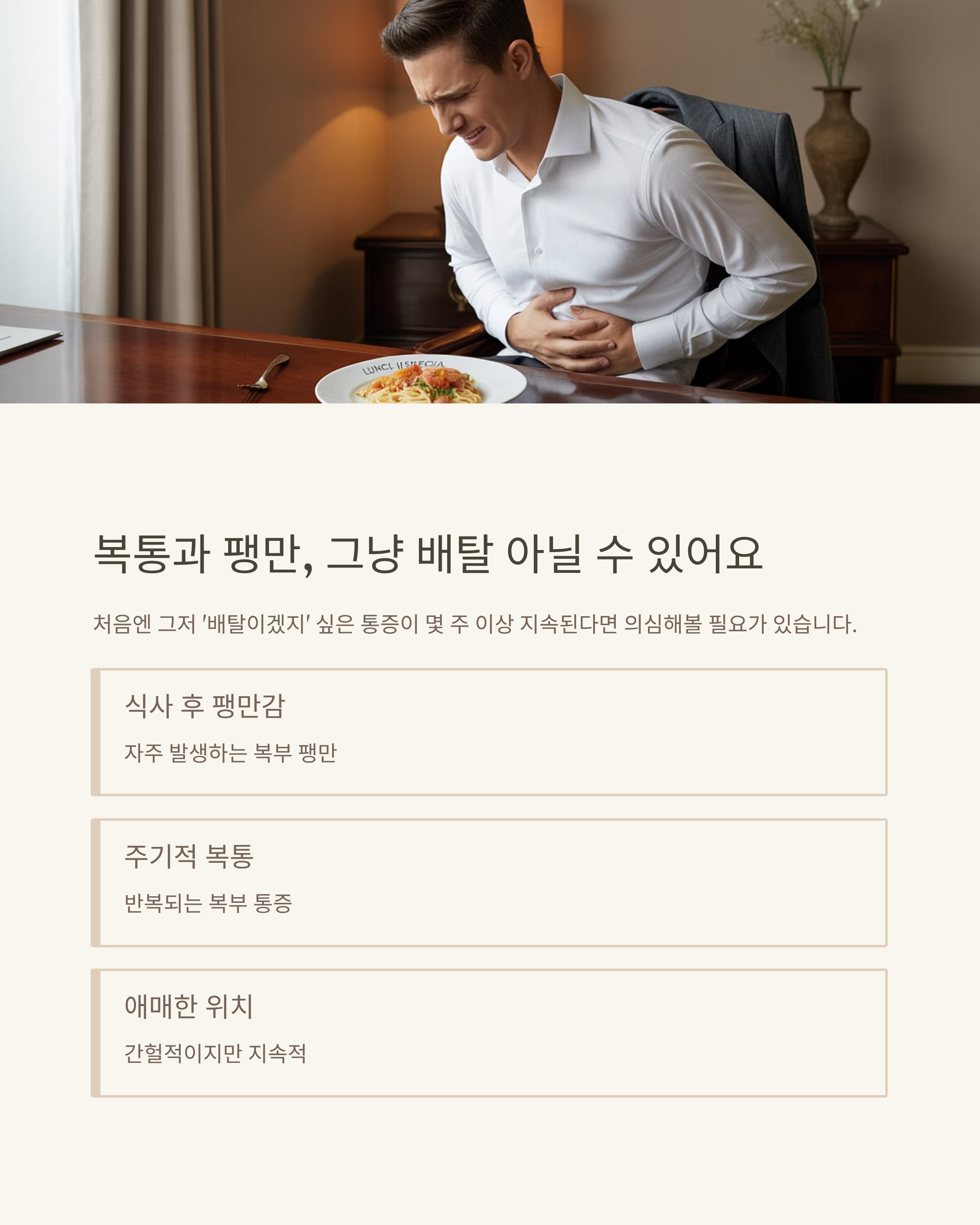 특히 식사 후 복부 팽만이 자주 발생하거나 복통이 주기적으로 반복된다면 주의하세요.