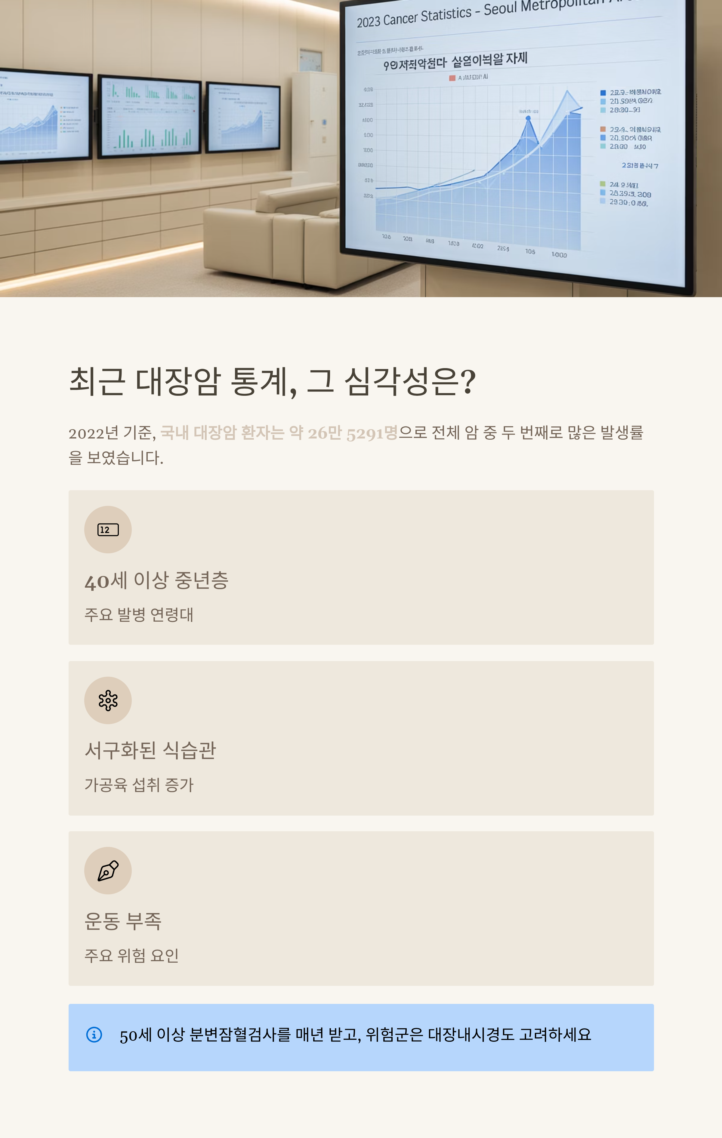 대장암은 조기 발견이 생존율을 결정짓는 핵심입니다.