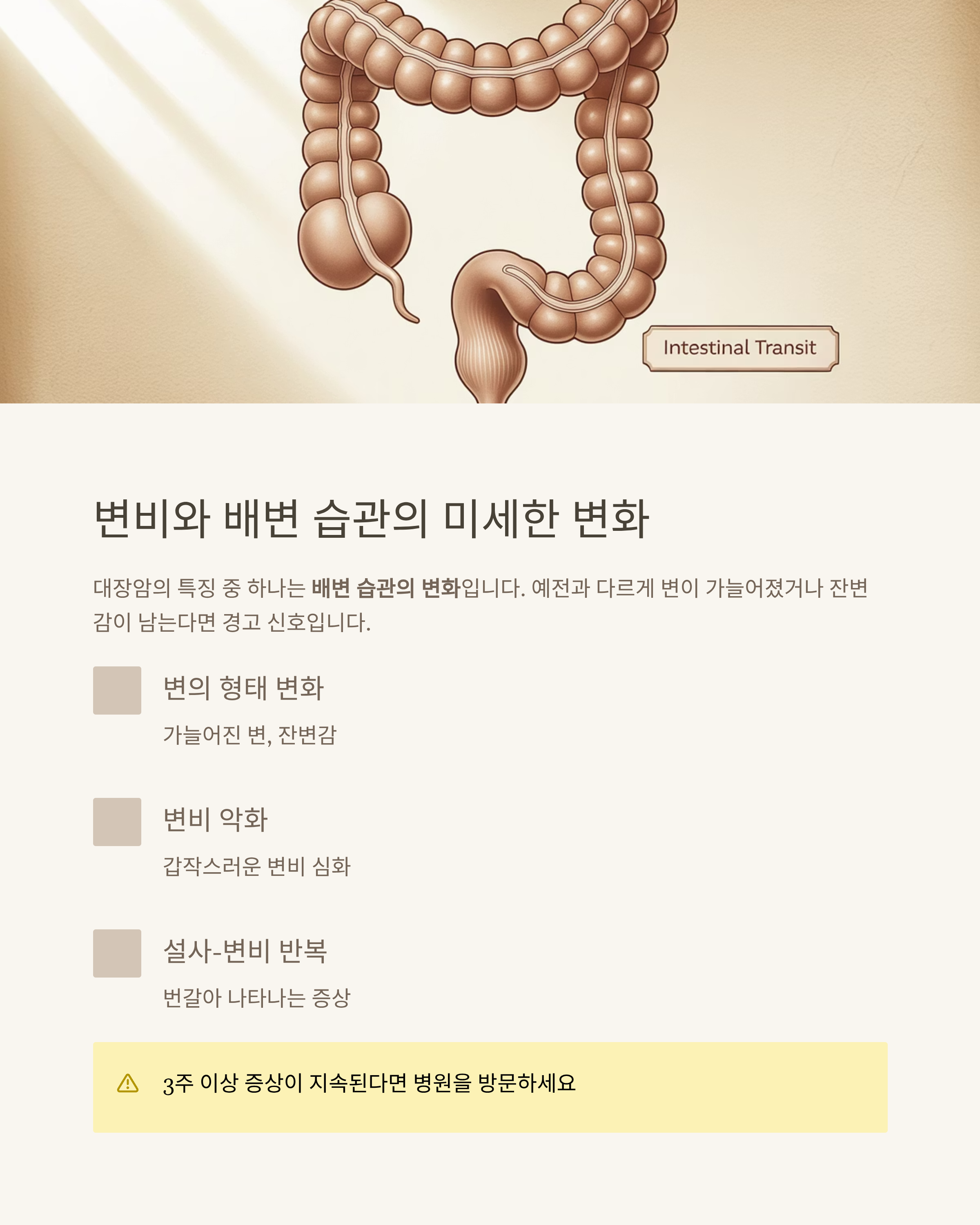 대장암의 특징 중 하나는 배변 습관의 변화입니다.