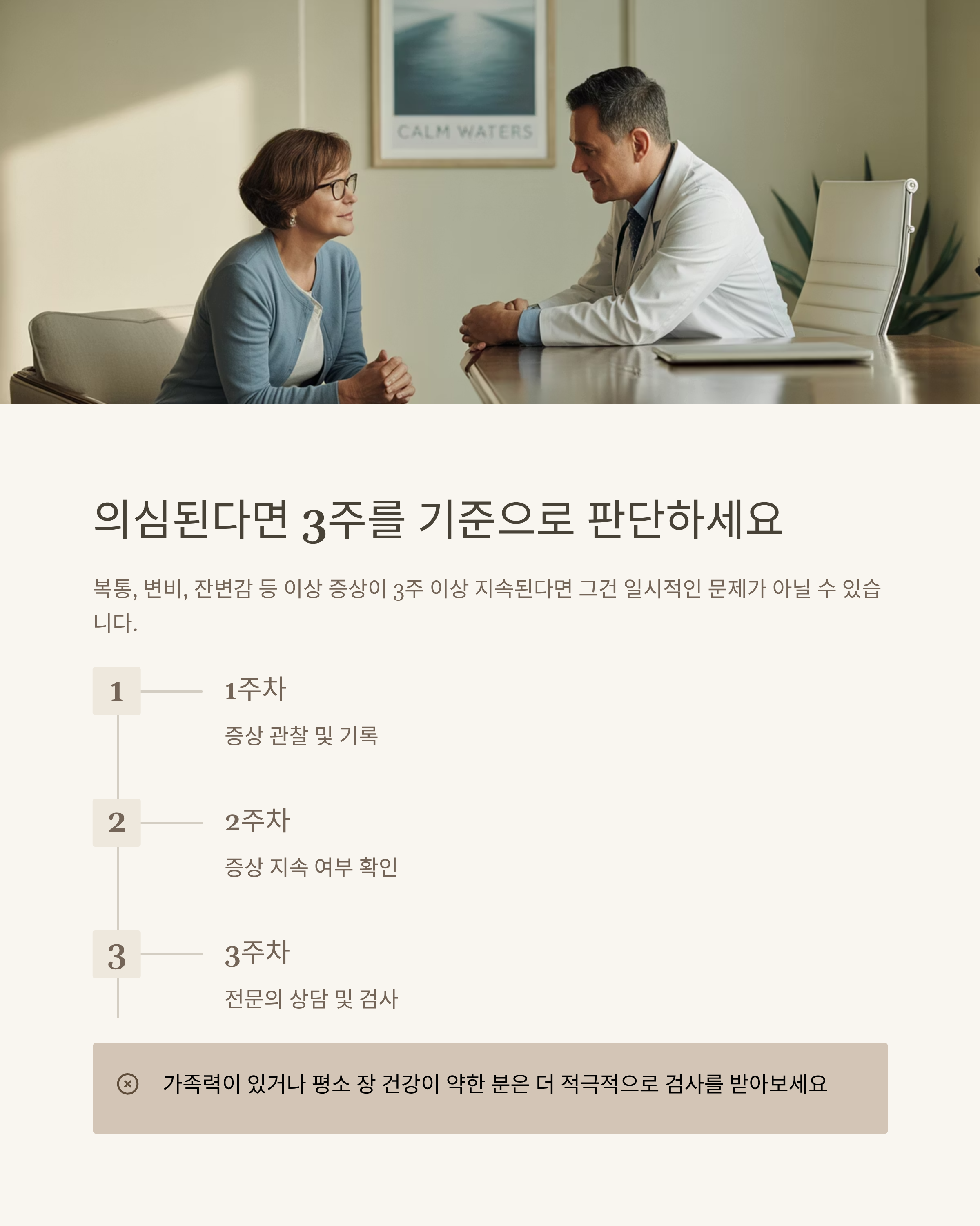 복통, 변비, 잔변감 등 이상 증상이 3주 이상 지속된다면