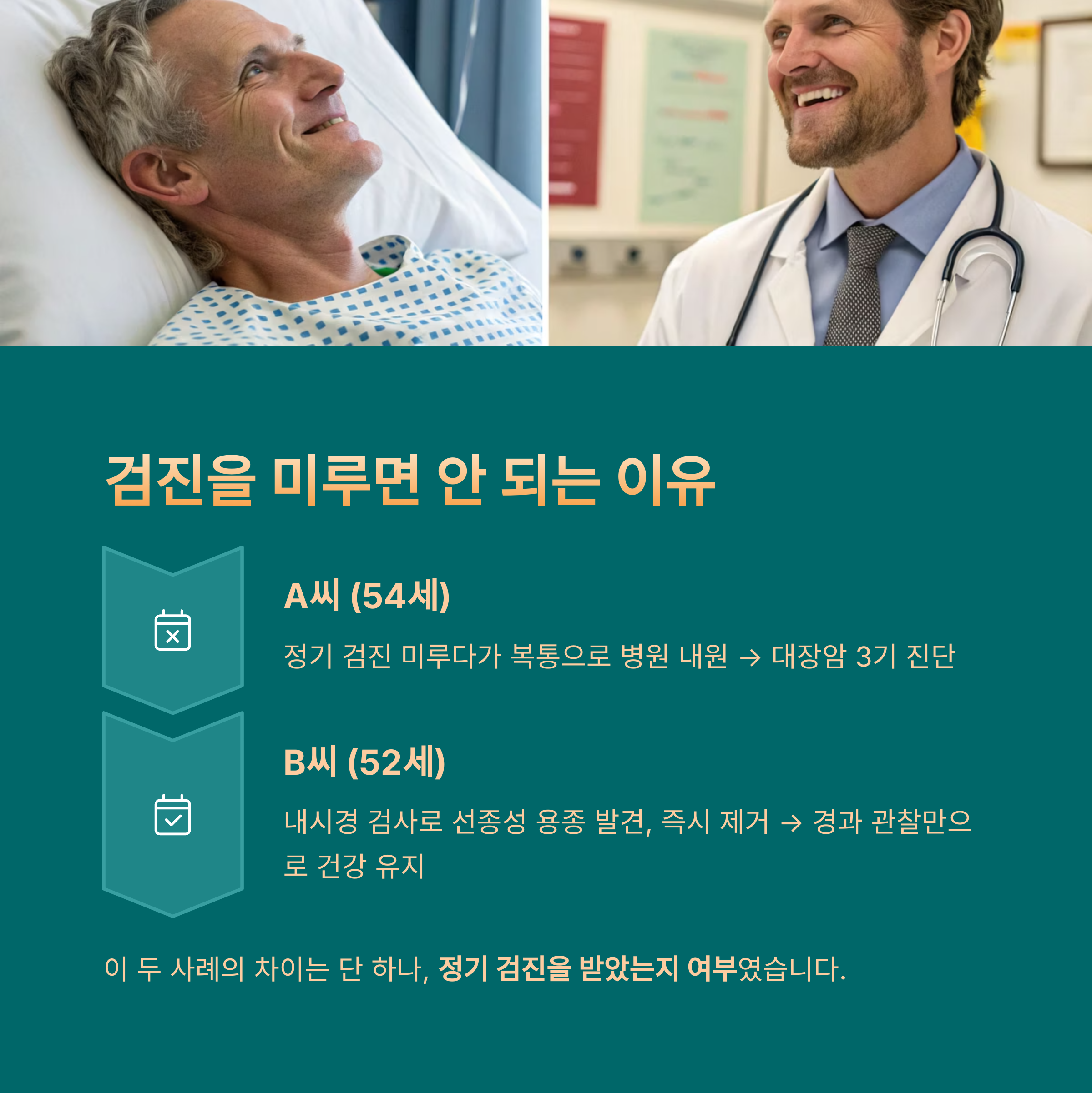 - B씨 (52세): 내시경 검사로 선종성 용종 발견, 즉시 제거 → 경과 관찰만으로 건강 유지
