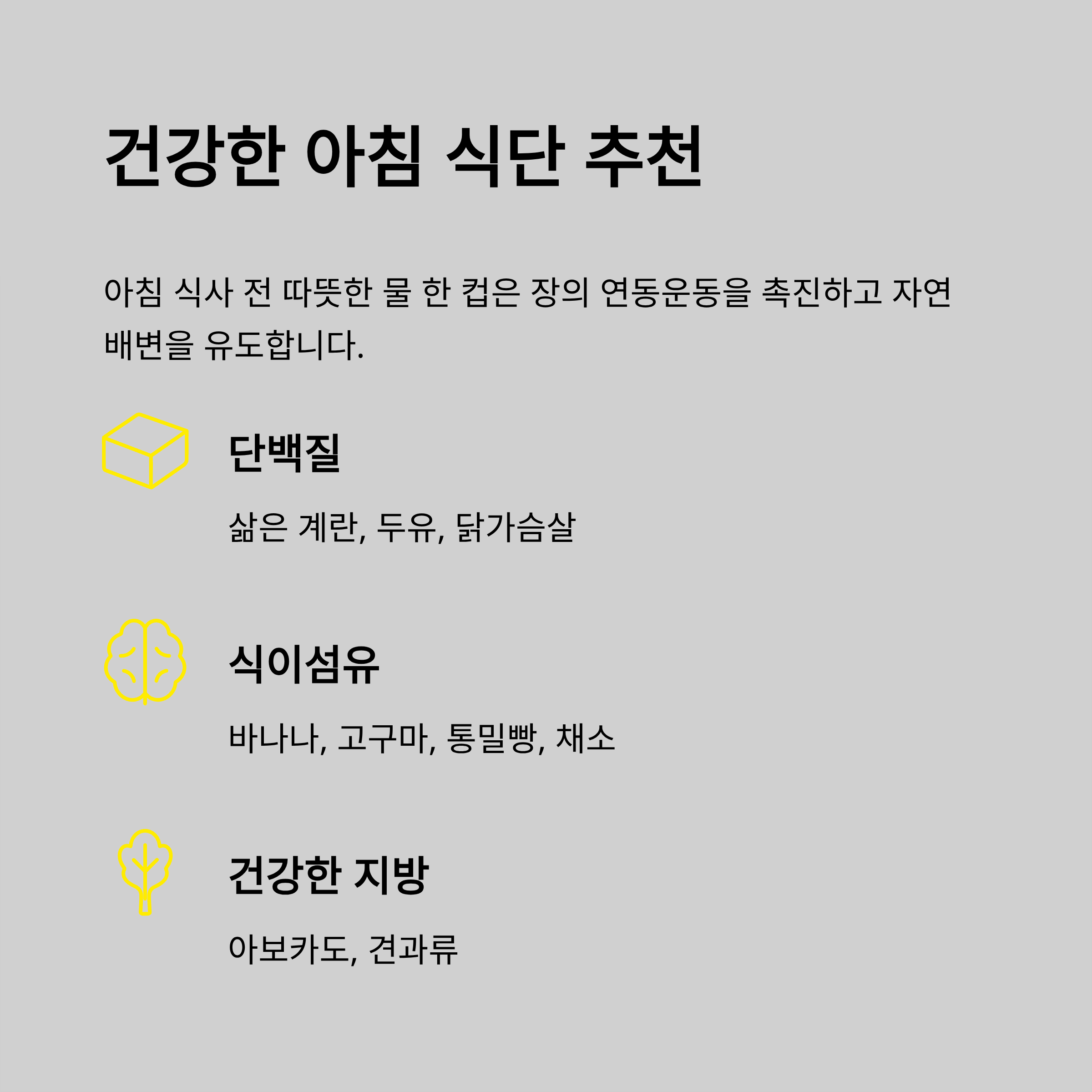 | 단백질 | 삶은 계란, 두유, 닭가슴살 |