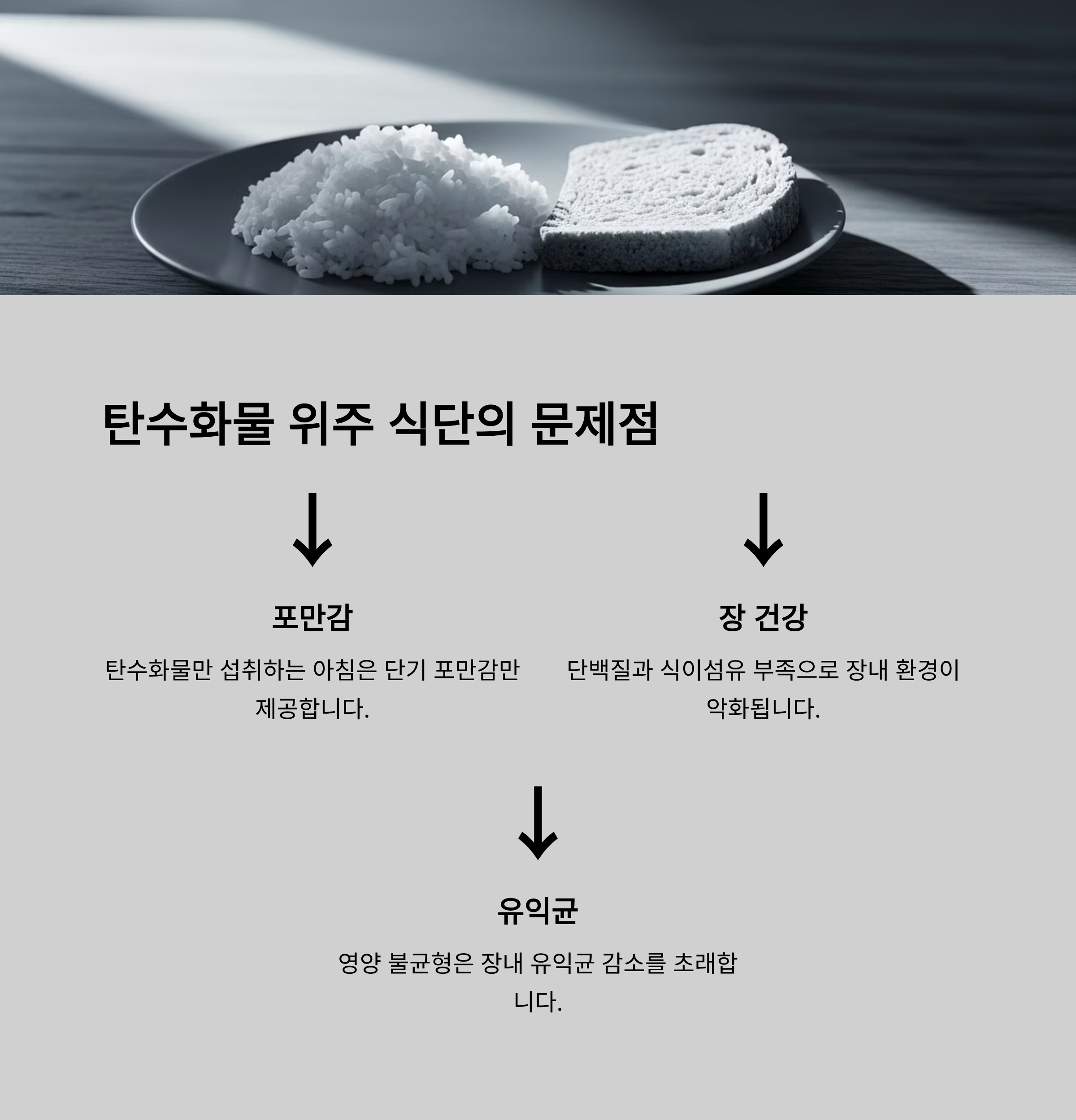 밥, 빵, 시리얼 등 탄수화물만 섭취하는 아침 식사는